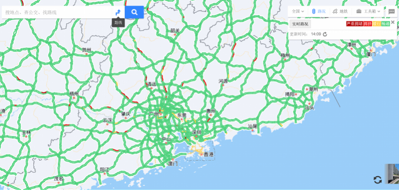 截至2月7日14时许,广东省高速缓行路段有:广佛肇高速公路(肇庆市高要区西角立交至禄步镇)、京港澳高速公路(清远市佛冈县汤塘镇)、广连高速公路(清远市阳山县青莲镇至新田隧道)、二广高速公路(肇庆市广宁县石门隧道至广宁互通、肇庆市广宁县宾亨收费站至坑口大桥)、深岑高速公路(佛山市高明区高村立交至更合镇、深圳市宝安区航城街道至鹤洲收费站)等。