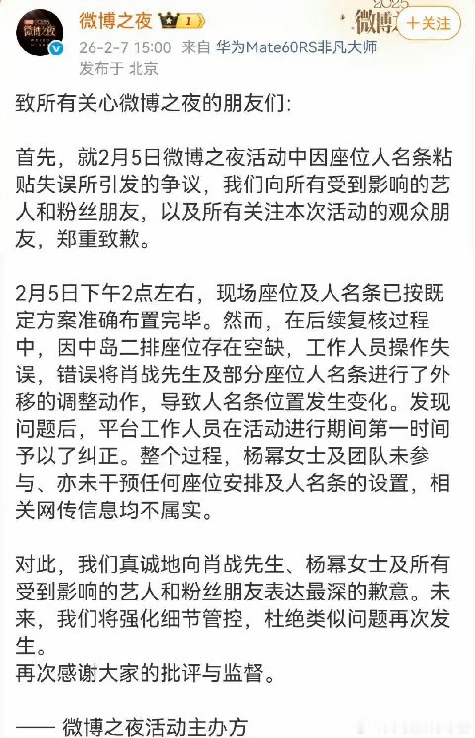 微博之夜针对杨幂 肖战内场座位事件再发声明微博之夜声明