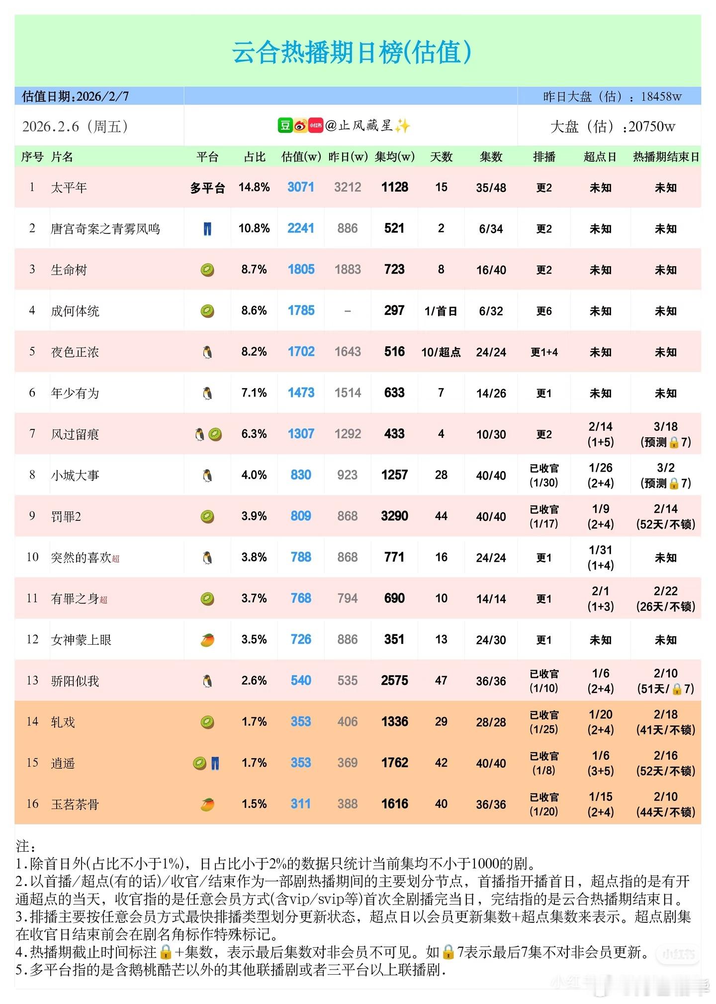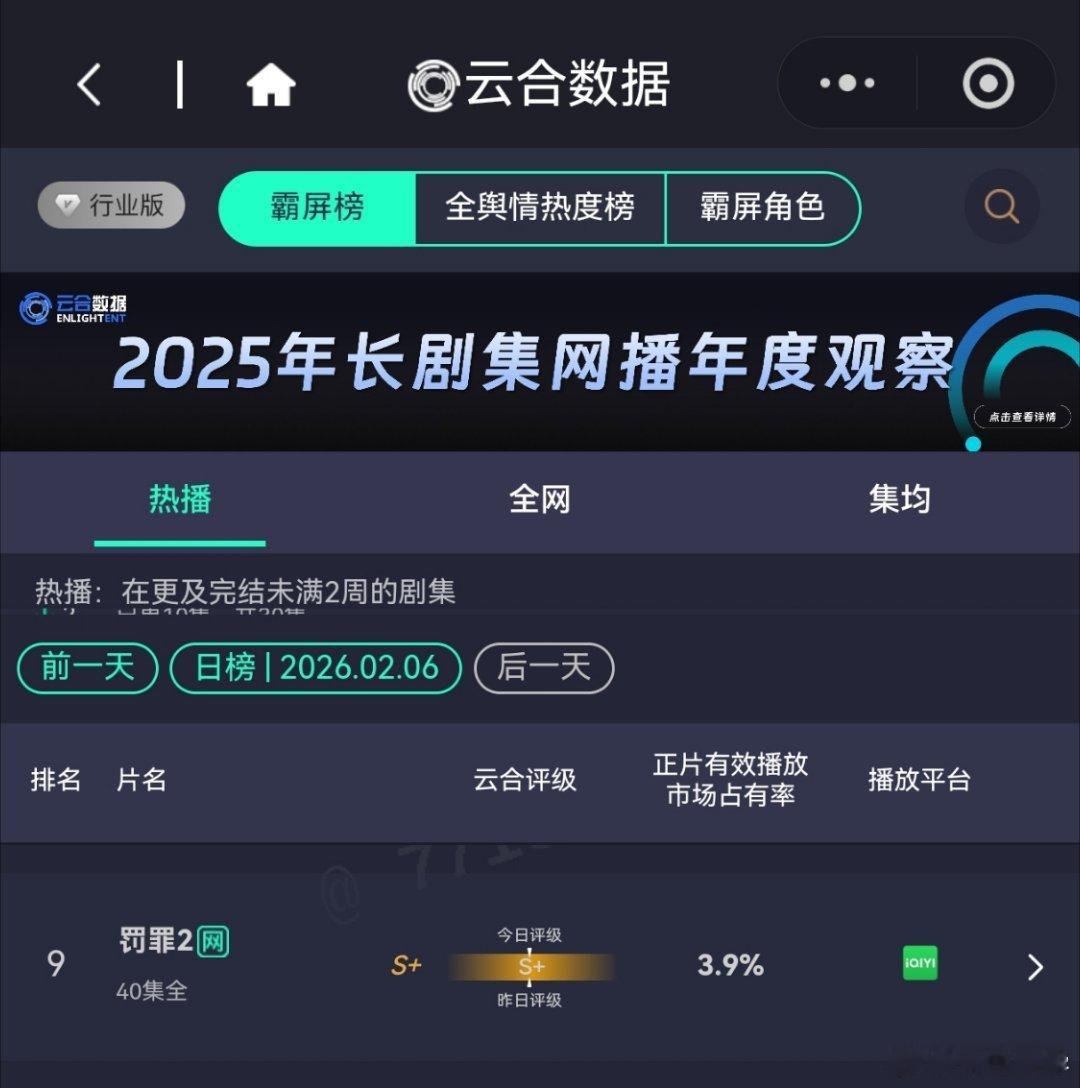 2月6日,罚罪2VIP更新结束第21天,今天排第9,集均估3290。热播期预测还有8天,罚罪,云合第23,《冬至》云合网络剧26。黄景瑜罚罪2黄景瑜秦枫