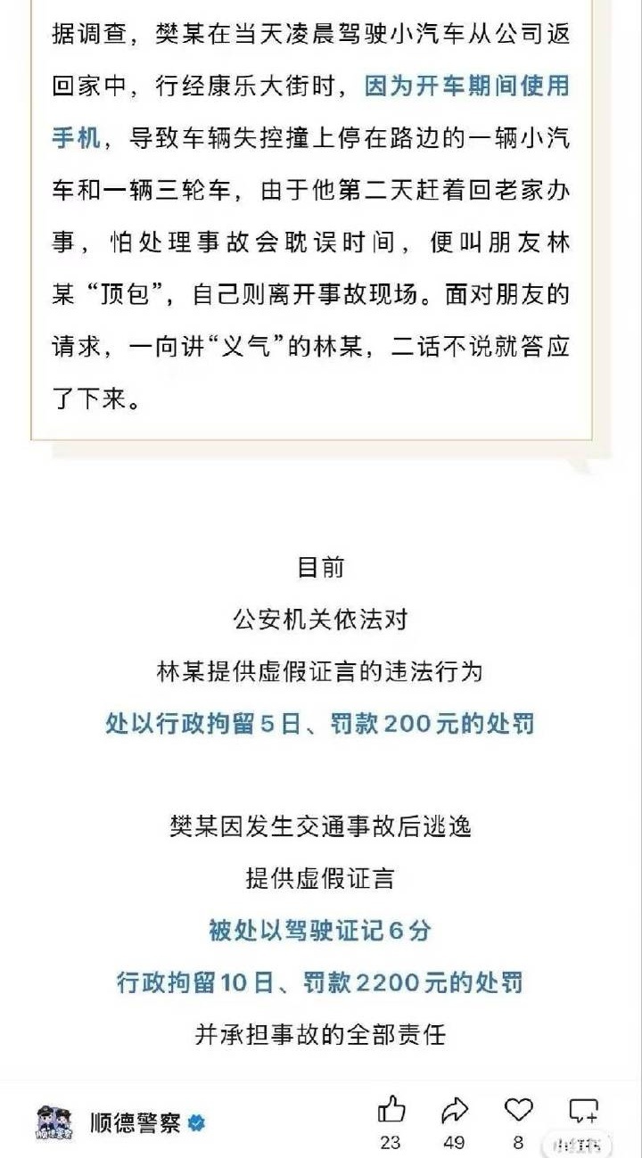 金晨肇事逃逸事后10个月才被追责,且未对其找人“顶包”行为做出处罚,仅给予罚款1500元的行政处罚,不管助理徐长青是不是“自愿”,都构成事实上的“顶包”行为。此前类似情况的处罚,均有行政拘留,是明星有特权?还是地方执法存在差异性?金晨肇事逃逸被罚1500元满谈娱乐