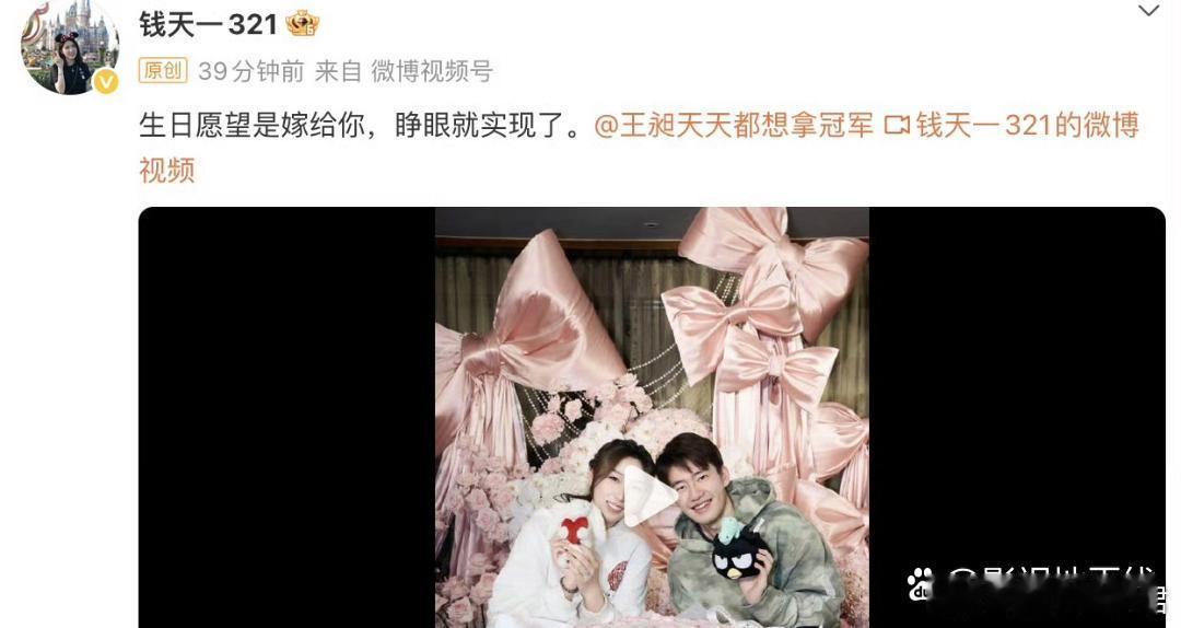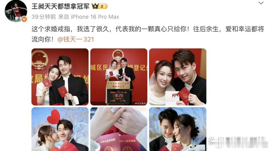 王昶钱天一结婚7日,羽毛球运动员王昶官宣与乒乓球运动员钱天一领证结婚,他写道:“这个求婚戒指,我选了很久,代表我的一颗真心只给你!往后余生,爱和幸运都将流向你!”钱天一也分享了王昶求婚视频,“生日愿望是嫁给你,睁眼就实现了。”恭喜!