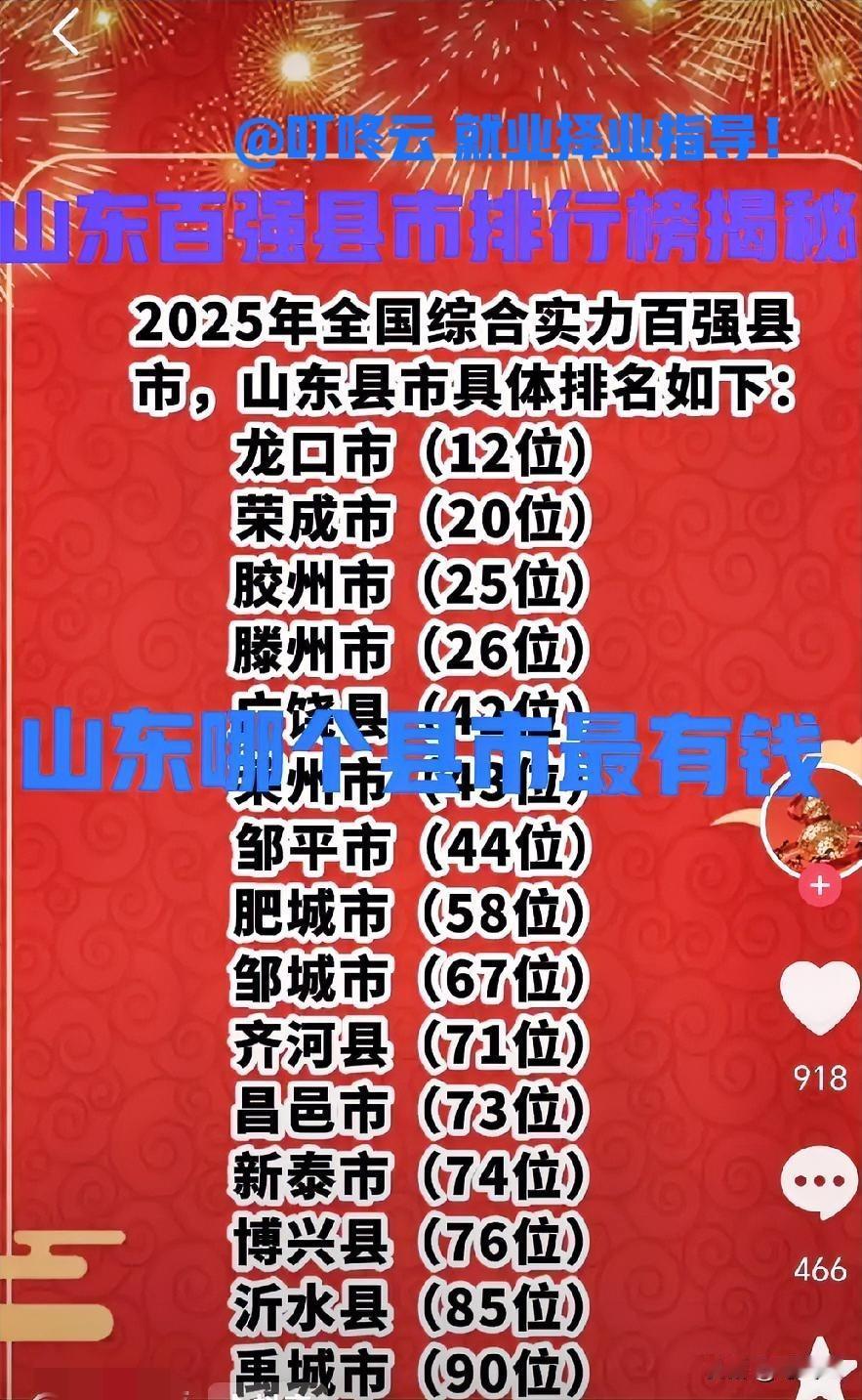 山东哪个县市最发达?2025年全国百强县市—山东省入围县市排行榜揭秘!快来看看你家乡入选了吗?龙口依然是第一名!荣成市、胶州市、滕州市、邹平市等排名居前列!这些都是经济发达县市,经济活力非常高,人口大量流出!速速围观揭秘详细内容![赞][赞][礼物][礼物] 欢迎关注@叮咚云 将优先为粉丝职业规划指导,1对1咨询是付费服务,为你定制最适合的就业择业方案!欢迎留言交流讨论。[来看我][来看我] 免责声明:图片来自网络,仅供参考! 山东行政区划