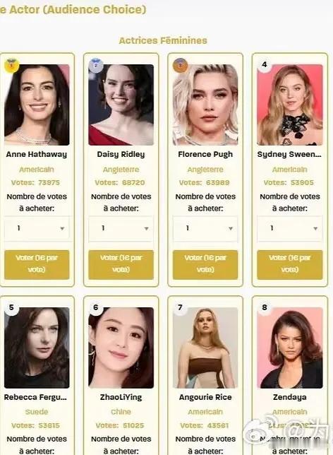 赵丽颖拿下全球观众最喜爱女演员奖第六名(亚洲第一)2025年欧洲世界电影节新增的“全球观众最喜爱演员”奖,是由全球观众投票产生的奖项,可以理解成国内百花奖的得奖形式。赵姐票选成全球女星第6,国内第一且是唯一上榜女星,前十里唯一的亚洲女演员!