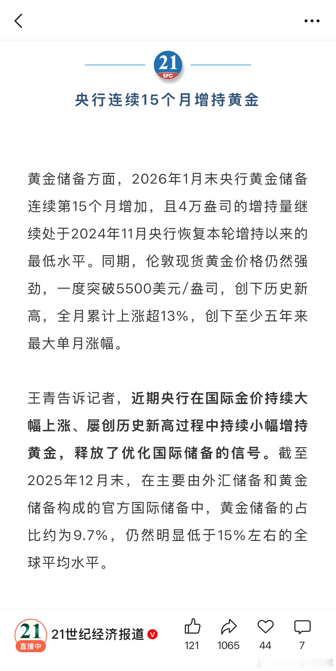 中国央行持续第十五个月增持黄金,在国际金价持续大幅上涨,屡创历史新高过程中持续小幅增持黄金,释放了优化国际储备的信号。黄金在长期保值增值避险抗通胀等方面存在不可替代的优点,兼具金融和商品的多重属性,央行正在推进国际储备多样式,在组合配置中加入以及动态调整黄金储备的战术操作不会改变,而且持续增持黄金的整体战略趋势也不会改变。黄金