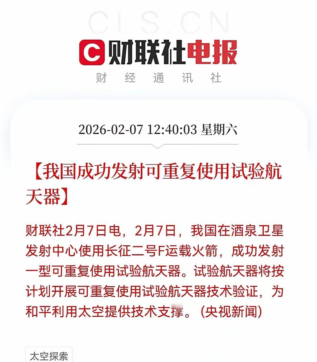 商业航天大消息。上车商业航天的兄弟们,开心了。商业航天大利好。 可重复使用的航天器发射成功。 商业航天,会不会成为2026的主线。这利好一个接一个。上海2026年,重要的发展方向,商业航天、低空经济等新赛道,再造万亿产业。 我国在酒泉卫星发射中心使用长征二号F运载火箭 成功发射一型可重复使用试验航天器。 发展商业航天,就是强国之根本。