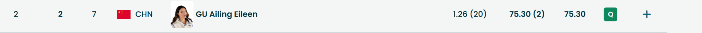 谷爱凌锁定决赛冬奥会女子坡面障碍技巧资格赛,26位参赛选手选TOP12,中国军团三人晋级决赛!谷爱凌第一滑1.26 (20) 第二滑75.30 (2) 最好分:75.30分 确认晋级决赛 韩林杉第一滑43.93 (11) 第二滑62.98 (5) 最好分:62.98分 确认晋级决赛 刘梦婷第一滑47.98 (8) 第二滑55.10 (7) 最好分:55.10分 确认晋级决赛 杨如意第一滑10.38 (19) 第二滑42.45 (10) 最好分:42.45分 确认无缘决赛