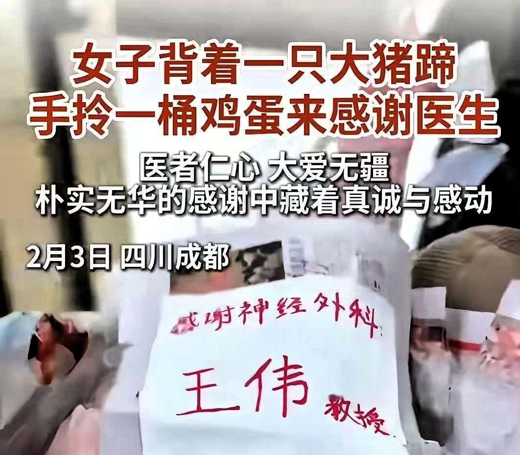 看着那满满一背篓的肉,我是真没觉得违规,反倒看得鼻子发酸。 反倒心里又暖又酸,这哪里是简单的送礼,这是川渝农村百姓把救命恩人当至亲,掏心掏肺的感恩,是最朴素也最厚重的一份心意。 华西医院难进、手术难度大是公认的,王医生为了救大姐,在手术台上一站就是大半天,硬是把人从死神手里拉了回来。这份救命之恩,大姐记在了心里,也用自己能想到的最实在的方式去回报。土鸡蛋是她一颗颗攒了好几个月的,猪腿更是当地认至亲才会送出的最高礼遇,这些东西带着泥土气和烟火味,没有半分功利,只是一个普通人能拿出的全部真心。 有人拿纪律条令说事,认为医生不能收礼。可规矩的初衷本是杜绝贪腐、守住职业底线,从来不是为了冷落老百姓的一片赤诚。若是当面拒绝这份心意,大姐心里必然一辈子不安,觉得欠着这份救命情没还上,这份纯粹的感恩之心也无处安放。 王医生的做法特别通透,他收下了这份沉甸甸的心意,转头就分给了科室的同事们改善伙食。这样的做法,既没驳了大姐的面子,成全了她的感恩之心,又守住了医院的规矩,没让这份纯粹的心意变味,妥妥的两全其美。 冰冷的规矩,本就该为滚烫的人心留有余地,而非让人心去迁就条条框框。比起那些藏着利益的红包,这种带着乡土味的人情味才最珍贵,也是医患之间最动人的双向奔赴。医生守着仁心治病救人,患者捧着真心感恩回馈,无关利益,只凭真心,这就是最美好的相处模样。
