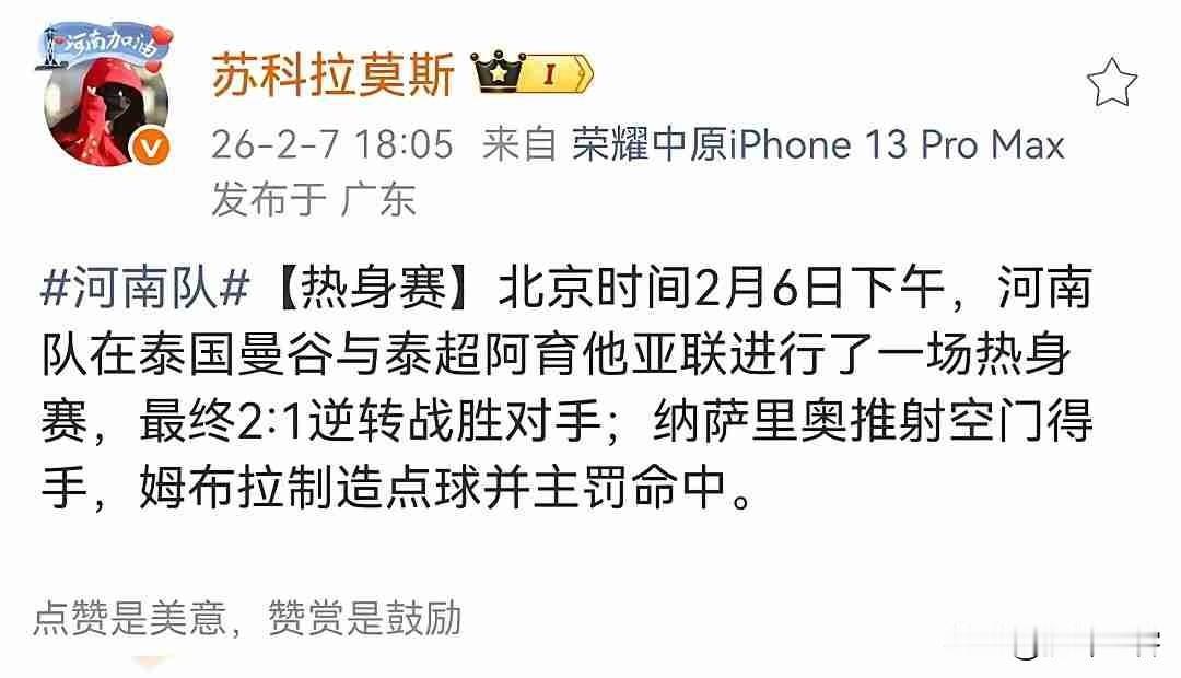 状态不错。河南队泰国集训迎来热身赛以胜利告终! 昨天下午在泰国进行冬训的河南队与泰超第七名球队阿育他亚联进行了一场热身赛,结果凭借纳萨里奥进球和新援姆布拉创造的点球破门以2:1战胜对手,不过比起胜利而言,更重要的是新援姆布拉的状态不错,这也意味着他已经顺利的融入了拉莫斯的战术体系,充分担当起自己的职责 ,也让球队在新赛季有了更大的“底气”。 纵然新赛季河南队以负分起步,但是小编认为本赛季引进的古斯塔沃和姆布拉的个人能力应该在卡多索和阿奇姆彭之上,只要能够充分和球队结合形成合力,2026赛季河南队仍然是一支不可小觑的力量![作揖][作揖][作揖] 带定位晒今日生活 我的今日状态:😁轻松愉快 我这里的天气:☀️晴天