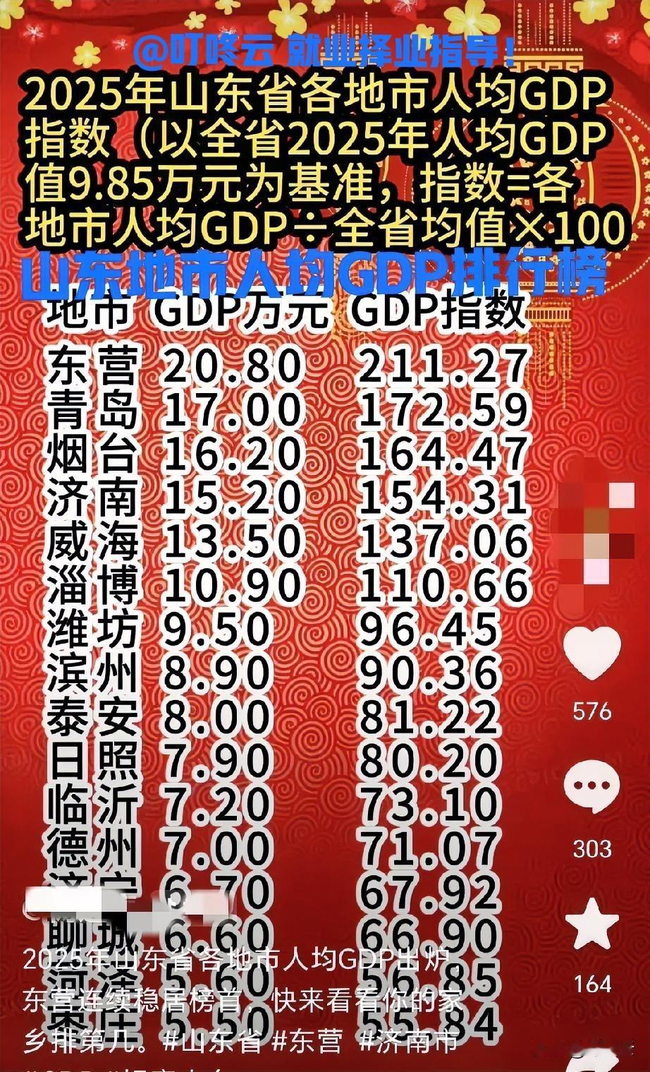 人均终于来了!山东省2025年地市人均GDP排行榜揭秘!全省人均9.85万元,超过平均值就是发达地区。你的家乡在哪里?人均GDP有多少,当地的经济发展情况怎么样?根据数据分析来看,山东各地依然是西低东高,内地低于沿海地区,经济差异非常大!人往高处走,水往低处流!人要赚钱吃饭,鸟要找食儿!由于各地区经济差异,导致人口大量流入沿海地区。速速围观揭秘详细内容!希望2026年越来越好!同学们都能找到合适工作,实现职业梦想![礼物][礼物][点亮平安灯][点亮平安灯] 欢迎关注@叮咚云 将优先为粉丝职业规划指导,1对1咨询是付费服务,为你定制最适合的就业择业方案!欢迎留言交流讨论。[来看我][来看我] 免责声明:图片来自网络,仅供参考! 山东GDP 山东经济