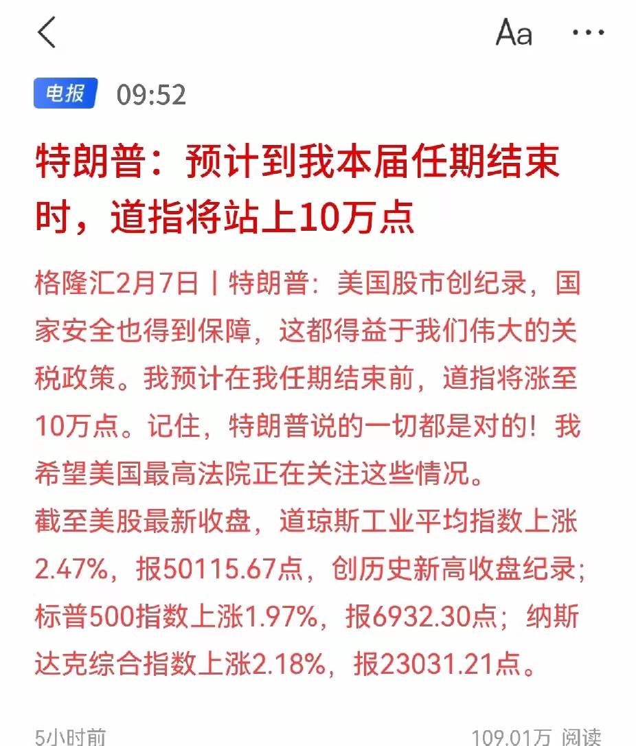 美股若到10万点,A股能涨多少? 昨晚,道指历史性突破5万点大关,堪称股市中的一大盛事。更引人注目的是,TLP表示在其任期结束时,美股要涨到10万点。如果真如所言,那意味着短短2年多时间美股就要翻倍,这无疑是一个极具震撼性的预期。 美股的走势一直备受全球关注,其若能大幅上涨,对全球金融市场必然产生深远影响。从逻辑上看,美股若持续走高,货币政策大概率会保持宽松态势。而全球货币政策的宽松,会使得资金流动性增强,更多资金会在全球市场寻找投资机会。A股作为全球重要的资本市场之一,自然会吸引部分资金流入,这对A股来说无疑是利好消息。 再者,如今人工智能正引领一场科技革命,若美股因科技革命带动经济增长而上涨,那么A股也有望受益。中国在人工智能等科技领域同样投入巨大,且取得了不少成果。科技革命是全球性的,它会带动整个产业链的发展,A股市场中的科技板块,以及与人工智能相关的上下游产业,都可能迎来新的发展机遇,推动股价上涨,进而带动指数上升。 不过,虽然美股上涨可能给A股带来诸多利好,但A股能涨多少,还需综合多方面因素考量。 从A股自身来看,2026年我国宏观经济有望在政策支持下保持稳健复苏态势,这为A股的上涨奠定了坚实基础。政策层面,财政政策与货币政策双宽松,将为市场提供充足的流动性。而且,随着国内经济结构调整,先进制造、科技创新等新动能加速崛起,会有更多优质企业涌现,提升A股的整体质量和投资价值。 回顾历史,A股的走势虽会受外部市场影响,但也有自身独立性。2015年牛市时,A股总市值高点与居民存款总额有一定比例关系。若按当时比例推算,结合当前居民存款总额情况,有分析认为A股若迎来牛市,上证指数甚至有突破10000点的可能。但这只是一种理论推算,实际情况要复杂得多。 至于美股能否真的涨到10万点,这仍存在很大不确定性。尽管美股过去表现强劲,但要在2年多时间内翻倍,难度不容小觑。经济发展有其自身规律,即使有货币政策支持和科技革命推动,也难以保证美股能持续如此高速上涨。全球经济形势复杂多变,贸易摩擦、地缘政治等因素,都可能对美股走势产生影响。 综合来看,如果美股真的涨到10万点,A股大概率会迎来上涨行情,但具体涨幅难以精确预测。A股的上涨幅度不仅取决于美股的走势,更关键的是国内经济的发展态势、政策支持力度以及市场自身的供求关系等因素。而美股能否达到10万点,还是一个未知数,值得投资者持续关注。大家不妨大胆猜测一下,你认为A股最终能涨多少点?美股又是否能顺利站上10万点大关呢?欢迎在评论区留言讨论。