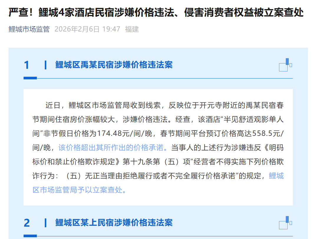 鲤城区、丰泽区均位于泉州市中心城区,因汇集泉州古城、开元寺、西街,以及西湖公园、清源山等知名景点,酒店民宿众多。根据通报,一家位于开元寺附近的某肆酒店,春节期间住宿房价涨幅较大,涉嫌价格违法。经核查,该酒店“标准大床房”非节假日价格为202.52元/间/晚,春节期间平台预订价格高达975.5元/间/晚(相当于平日的4.8倍),该价格超出其所作出的价格承诺,违反《明码标价和禁止价格欺诈规定》,被予以立案查处。