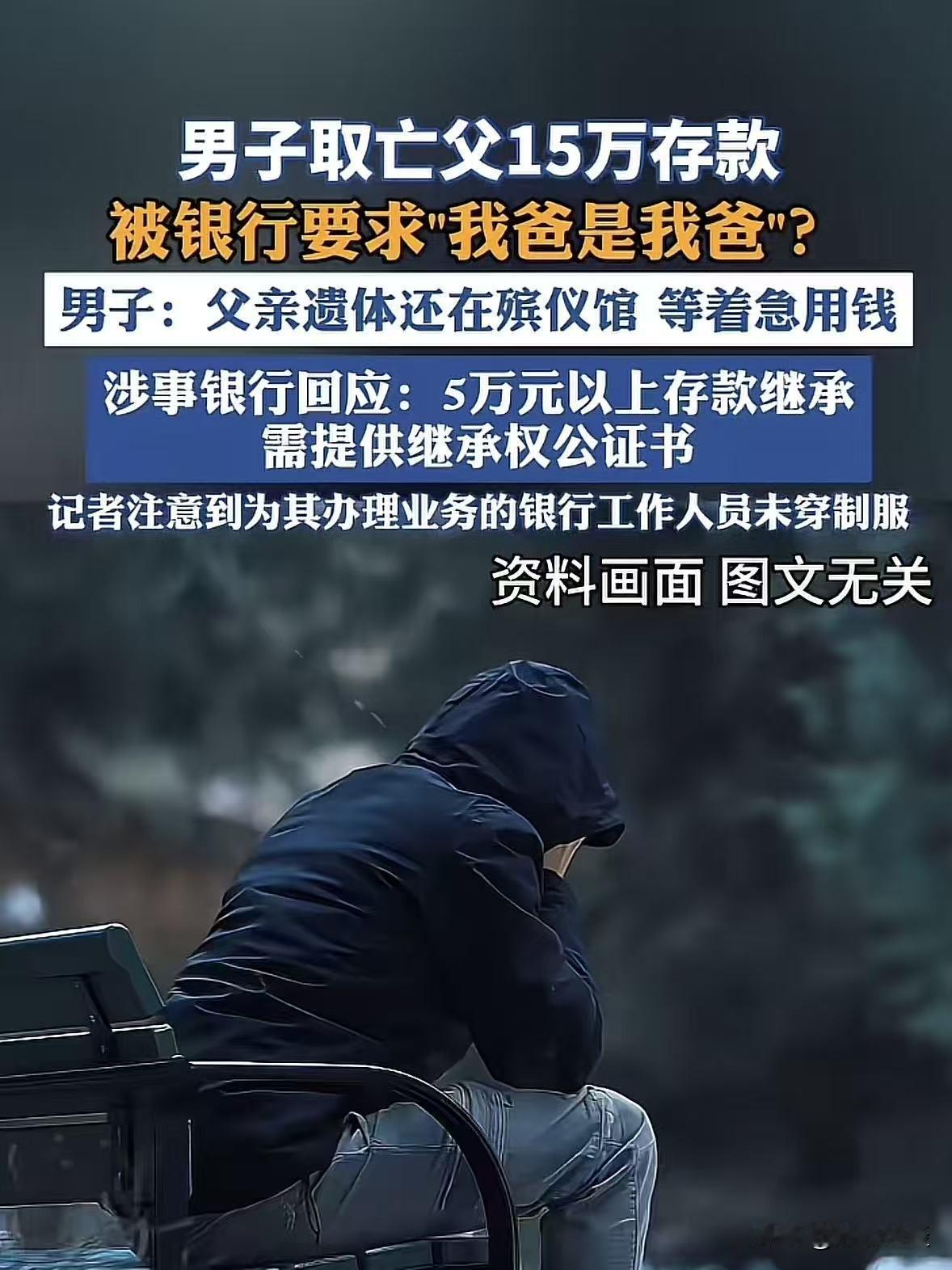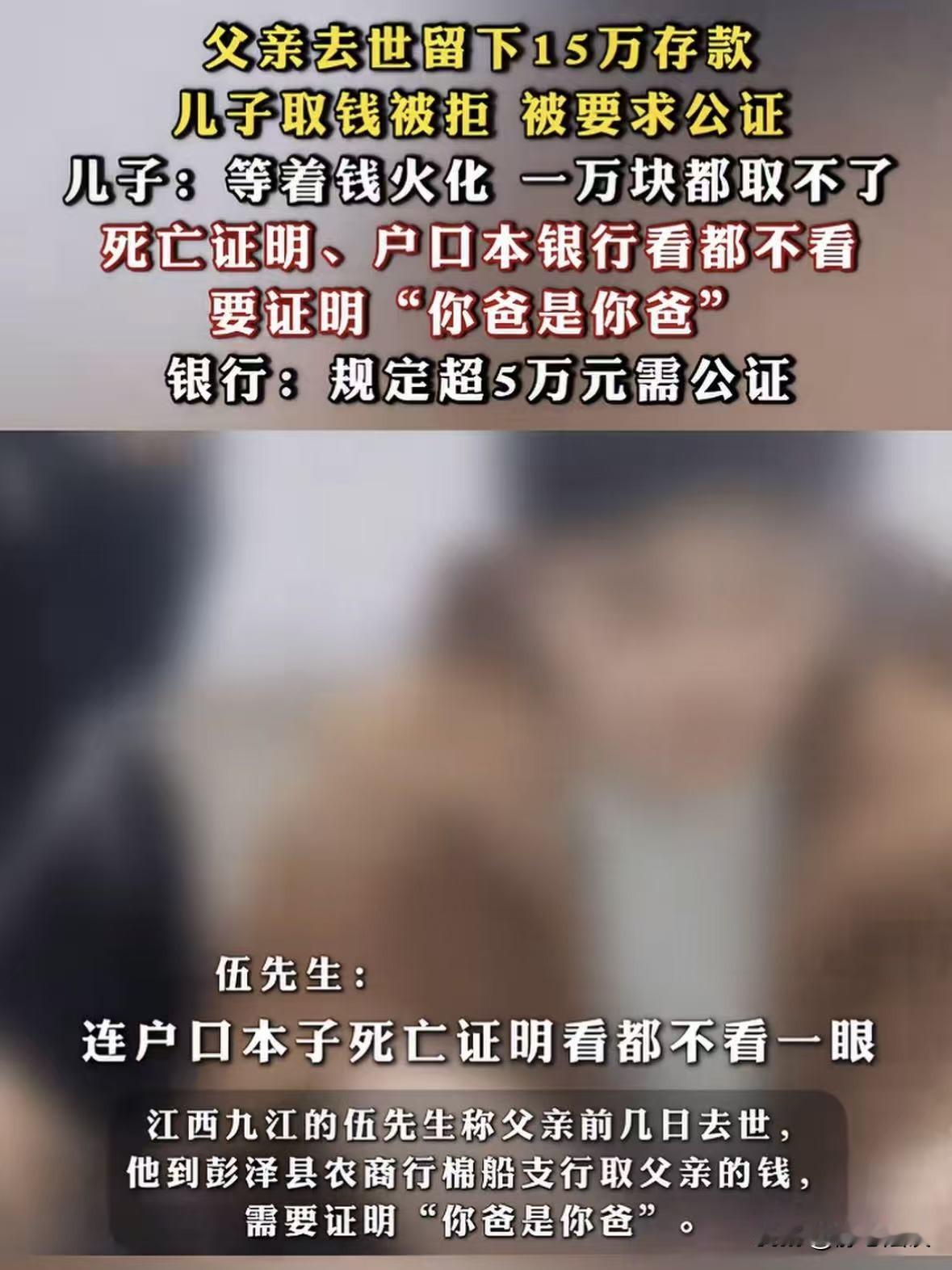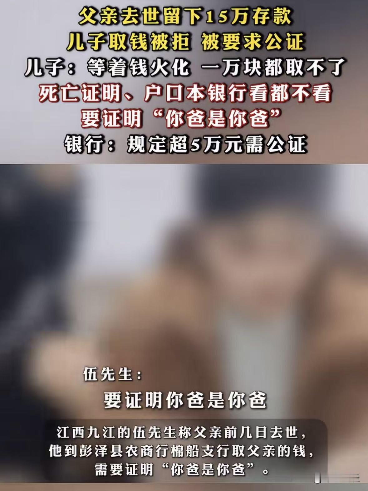 江西九江,男子父亲意外去世,父亲生前有15万的存款,男子拿着父亲的死亡证明、户口本及相关证件去银行取钱,想要拿钱给父亲风风光光办个葬礼,谁知道到了银行后,工作人员一听,一眼都没看男子拿的证明,只睡了一句你得证明你爸是你爸才可以,男子气坏了,难道自己拿的证件不能证明吗?银行:按照相关规定,超过五万元需公证! 伍先生的老父亲走得突然,意外离世让一家人猝不及防。 悲伤之余,伍先生想起父亲生前跟自己说过存了15万元存款。 这钱是老人一辈子省吃俭用攒下的,伍先生想着正好取出来给父亲风风光光办场葬礼、让老人走得安心。 为了顺利取钱,伍先生特意提前整理了一堆证件。 父亲的死亡证明、户口本、身份证,还有能想到的相关材料,生怕落下什么耽误事。 他心里琢磨着,死亡证明能证明父亲确实不在了,户口本能证明自己和父亲的关系,取钱应该没有什么问题。 毕竟这钱是父亲的遗产,自己作为儿子,继承遗产天经地义。 可谁能想到,理想很丰满,现实却骨感得让人窝火。 伍先生揣着一沓证件,急匆匆赶到银行,跟工作人员表示: 我父亲去世,想把他账户里的15万取出来办葬礼。 还没等他把证件递到工作人员面前,对方连看都没看一眼,轻飘飘地抛过来一句话: 那你得证明你爸是你爸,不然这钱取不了。 伍先生当时就愣住了,手里的户口本还没完全展开,听见这话瞬间火冒三丈。 他指着户口本上的亲属关系登记,意思你看这户口本上写得清清楚楚,我跟我爸就是父子关系,还有死亡证明在这,怎么就不能证明了? 可银行工作人员态度也很坚决,意思这不是故意刁难,而是相关规定。 《储蓄管理条例》及相关规定,其中提到存款人死亡后,合法继承人应向公证处申请办理继承权证明书,银行凭此办理支付手续。 《关于简化提取已故存款人小额存款相关事宜的通知》:1万元以下的存款可以免公证提取。 2024年又发布新规,将小额免公证提取的标准提高到了5万元,但对于超过5万元的大额存款,依然要求提供公证材料。 伍先生的父亲存款15万元,属于大额继承,必须得提供公证处出具的继承权公证书,才能给办理取款手续。 伍先生告诉工作人员现在父亲等着这笔钱办葬礼,现在人还殡仪馆,难道还要拉过来? 他实在想不通,自己手里的户口本是派出所开的,死亡证明是正规医院开的。 这些怎么就证明不了最基本的父子关系,没想到证明你爸是你爸这种荒谬的要求,竟然发生在了自己身上。 后来伍先生气不过,把此事发到了网上,不少人都感同身受,纷纷吐槽自己遇到过的类似的事。 有人说:我之前取我妈留下的8万块存款,银行也是让我证明‘我妈是我妈’,户口本都不管用。 最后跑了好几趟公证处才办成,又花了几千块公证费,太折腾人了。 还有人表示:他们就是怕担责任,完全不管老百姓的实际情况,办葬礼本来就急着用钱,哪有时间慢慢走流程? 不过也有不少人理解银行的做法:他们也没办法,万一还有其他继承人,随便把钱给了一个人,到时候人家找上门来索赔,银行就得担责。 这件事不得不给一些老年人提个醒,可以在生前通过立遗嘱、办理遗嘱公证、告知继承人银行账户信息等方式,明确遗产分配。 这样既能避免身后子女因继承问题产生纠纷,也能减少取款时的麻烦。 就像有专业人士建议,老人可以提前将存款的相关信息告诉信任的子女,或者在银行预留继承人信息。 这样在去世后,继承人就能更顺利地办理取款手续。 话说回来,伍先生的事虽然是个例,但它戳中了很多人内心的痛点。 我们总以为亲人之间的身份关系是天经地义、无需证明的,可在制度和规定面前,却不得不为“证明你爸是你爸”这种基本问题奔波折腾。 其实银行的风险防控可以理解,但希望不以牺牲老百姓的便利为代价,更不能在人家遭遇丧亲之痛时,再添一层堵。 希望能有相关规定,能让老百姓在办理继承手续时,能够少一些折腾、多一些便利。 也让逝去的人能走得安心,活着的人能少些烦恼。 毕竟,孝心不该被繁琐的证明所阻碍,亲情也不该被冰冷的规定所冲淡。 对此,你怎么看这件事?