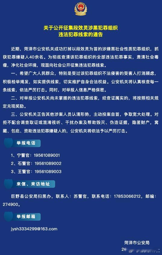 近日,山东省菏泽市中级人民法院发布的一则布告,引发广泛关注。公告表明,组织和领导黑社会性质组织、故意杀人的69岁的“黑老大”段效灵已被执行死刑。据现代快报报道,布告内容显示,罪犯段效灵,男,汉族,69岁,小学文化,菏泽市牡丹区人。1989年,罪犯段效灵任原菏泽地区公路局公路宾馆科长期间,与被害人李某某(殁年26岁)产生矛盾,遂产生杀害李某某之念、并纠集李某(已判刑)参与。1989年4月25日22时许,李某骑自行车载段效灵尾随李某某与妻子史某某至一村庄,段效灵在胡同内呼喊李某某名字,李某某、史某某闻声出来,段效灵持双管猎枪先后朝李某某、史某某开枪射击,致李某某颅脑严重损伤死亡,史某某轻微伤。2000年,罪犯段效灵得知被害人段某某在外辱骂自己,遂与李某(已判刑)共谋驾车撞击段某某。2000年7月的一天晚上,段效灵安排王某某将段某某约出,并指使李某驾驶渣土车停在段某某回家途经的路边伺机作案。次日1时许,段某某骑自行车经过时,李某遂驾车加速追赶撞击段某某,段某某多处受伤。2000年,菏泽市牡丹区北城办事处段一村民被害人武某某,因其儿子胡某的出租车被查扣并处以罚款,对时任菏泽公路局养路费征稽办公室主任的段效灵不满,并在村中非议。段效灵得知后怀恨在心,遂与李某(已判刑)、王某某共谋报复。2001年9月15日2时许,三人携带汽油、打火机等工具来到武某某家附近,段效灵在外等候,李某、王某某以“卖狗”为名骗开门,在门楼下将汽油浇在武某某头面部并点燃,致武某某被烧至重伤。布告显示,罪犯段效灵组织成立黑社会性质组织,系该组织的组织者、领导者,组织、领导该组织还实施了敲诈勒索、寻衅滋事、聚众斗殴等违法犯罪69次,其中犯罪60次,违法9次,涉及14个罪名。菏泽市中级人民法院一审审理认为,罪犯段效灵犯罪事实清楚,证据确实、充分,足以认定。决定执行死刑,剥夺政治权利终身,并处没收个人全部财产。宣判后,罪犯段效灵不服,提出上诉。山东省高院二审驳回上诉,维持原判。山东省高院依法将罪犯段效灵报请最高人民法院核准。最高人民法院经复核,依法裁定核准对罪犯段效灵判处死刑,剥夺政治权利终身,并处没收个人全部财产的刑事判决。近日,罪犯段效灵被验明正身,押赴刑场,执行死刑。另据菏泽市中级人民法院微信公众号,2022年,该院“审理了具有重大社会影响的段效灵等涉黑案,判处罪犯45人”。此外,2020年,菏泽市公安局曾公开征集段效灵涉黑犯罪组织违法犯罪的线索。