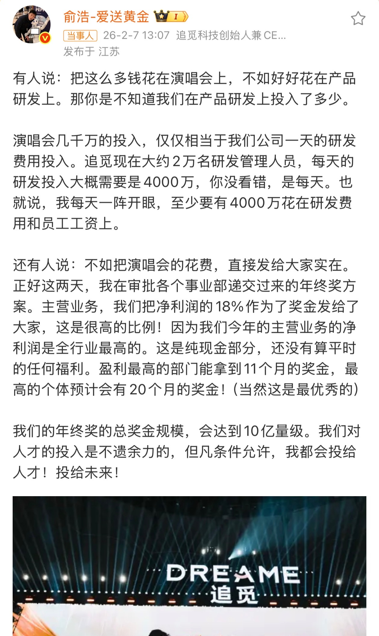追觅CEO称每天研发投入4000万俞浩是不是又喝多了?还是对公司的投入和营收没什么概念。
