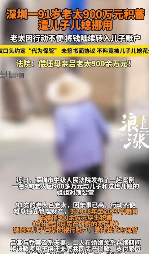 这就是养儿防老?广东深圳,91 岁老太年龄大了,怕自己突然老糊涂,就将 900 多万积蓄全部转给儿子,由儿子代为保管。 91 岁老太把一辈子攒的 900 多万交给儿子保管,结果钱被儿子儿媳私自用了,老太气得直接起诉。 老太年纪大了,管不了自己的钱,就把卖北京房子的钱和全部积蓄,陆续转给儿子,让他帮忙看着。 儿子儿媳没跟老太商量,就用这笔钱还了房贷,还装修了房子,日常开销也从这里拿。 后来儿媳去世,还立了遗嘱,把其中 300 万留给了自己的姐姐。 老太生病住院要用钱,找儿子要,才知道钱早就被花光了。 老太又气又急,把儿子和儿媳的姐姐都告上了法庭,要求把钱全部还回来。 有网友说,儿媳心眼太坏,没想到会把钱留给娘家;也有人说,儿子太自私,坑害自己的老母亲。 法院最终判儿子全额还钱,儿媳的姐姐也要在继承遗产的范围内承担责任。 养儿防老,不是让儿子坑自己的亲妈,这种行为真的太让人寒心了。
