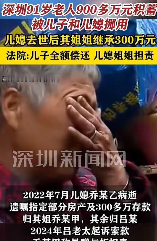 不要低估人性! 深圳一位 90 多岁的老太太,把 900 多万养老钱全转给独子,结果钱被儿媳拿走,还被儿媳立遗嘱给了她姐姐,这事太气人了。 2018 到 2021 年,吕老太年纪大、行动不便,就把卖房子的 900 多万,陆续转给儿子保管。 儿子拿到钱,转手就全给了儿媳。 儿媳用这些钱还房贷、装修房子,去世前还立了遗嘱。 她指定自己姐姐,继承 300 万和房子 50% 的产权。 老人知道后特别生气,把儿子和儿媳的姐姐告上了法院。 老人说这钱是借给儿子的,必须退回来。 对方却坚持,钱是老人赠与的,不用还。 有网友说,法院就算判了,老人也难拿到钱,毕竟年纪大了,对方不还也没办法。 还有网友觉得,儿媳太过分,不该把房产留给自己姐姐。 法院最后判了,这笔钱是老人让儿子保管的,不是赠与,必须全额返还。 养老钱是老人的依靠,子女可不能乱拿,做人得讲良心。