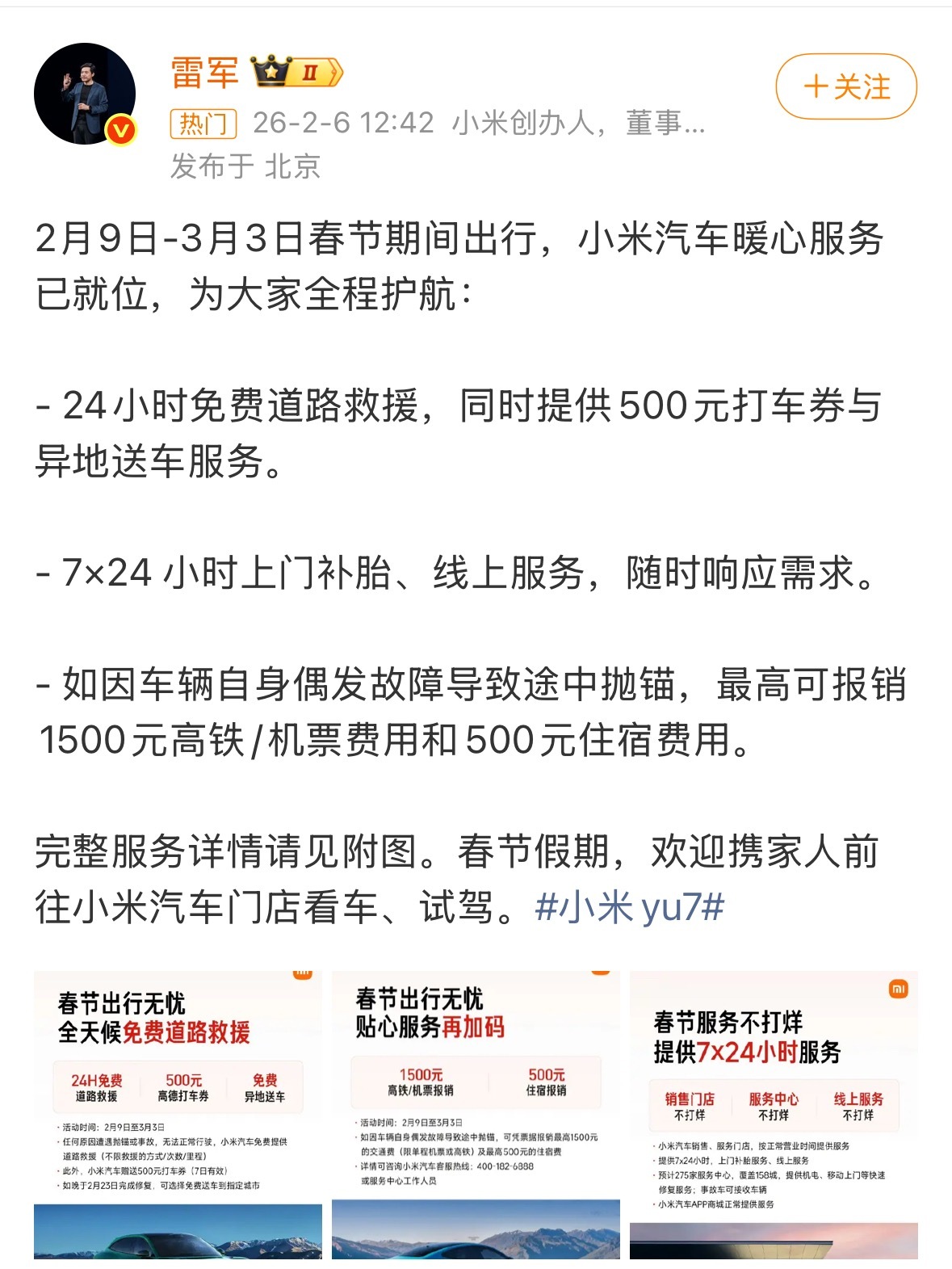 雷军宣布小米汽车免费道路救援小米汽车把春节出行保障焊死了!雷军出手就是王炸,不仅24小时免费道路救援覆盖春运全程,还直接给车主费用兜底:故障抛锚高铁机票住宿费最高报2000元,500元打车券应急,异地送车免费用!对比其他车企只修不补,小米直接搞全链条保障,158城网点7×24响应,新势力的服务内卷,车主是真享福!小米汽车雷军