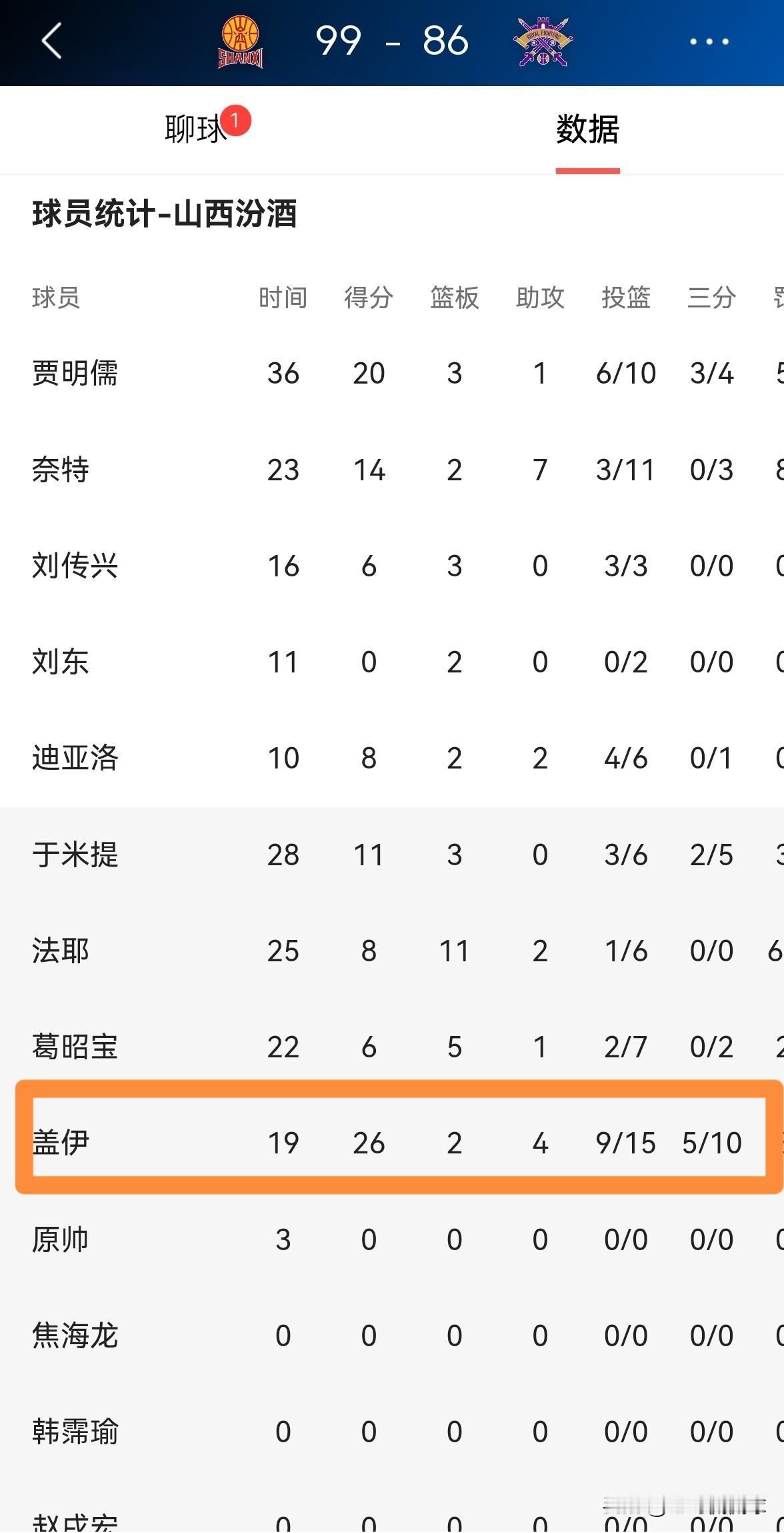 我忍不住要怒赞山西汾酒外援盖伊!在今天山西汾酒以99:86击败北京控股的CBA俱乐部杯1/4决赛中,盖伊再次打出了非常高效的表现。 全场比赛下来,盖伊替补出战19分钟,投篮15中9,其中三分球10中5、罚球3中3非常高效的砍下26分,还有2篮板4助攻,他的场上正负值为+8。 老实说,放眼当今CBA,盖伊的得分能力绝对属于最顶级的水准,盖伊是真正的得分利器。