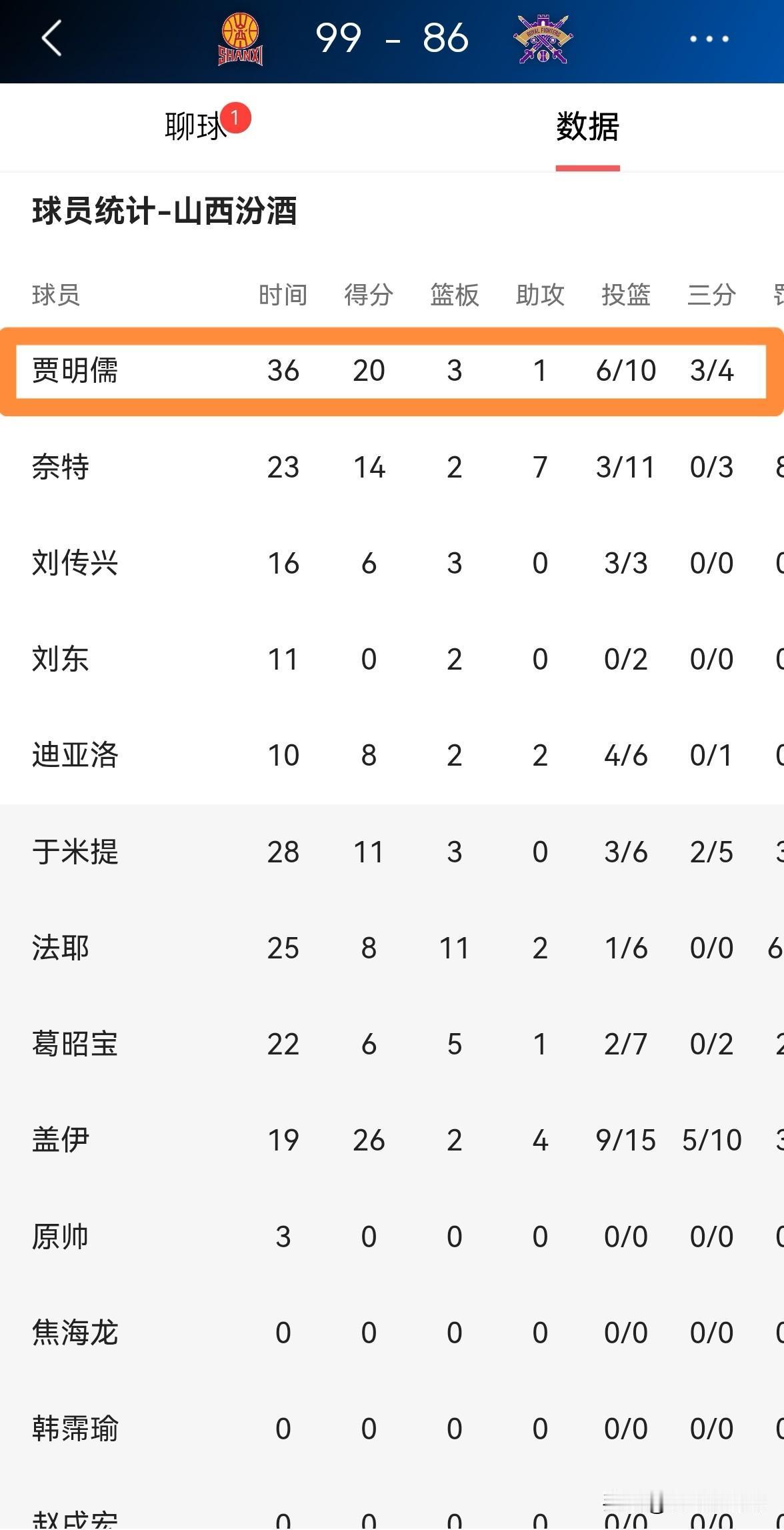 山西汾酒大将贾明儒真是居功至伟!在今天结束的一场CBA俱乐部杯1/4决赛中,山西汾酒以99:86战胜北京控股。本场比赛,山西汾酒大将贾明儒为球队的获胜立下了汗马功劳,他在首发出战的36分钟里,投篮10中6,其中三分球4中3、罚球5中5非常高效的砍下20分,还有3篮板1助攻2抢断,他的场上正负值为球队最高的+19。 值得一提的是,在关键的第四节比赛中,贾明儒的表现更是值得称赞。