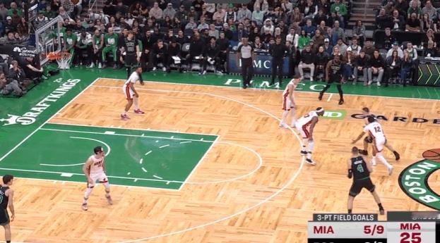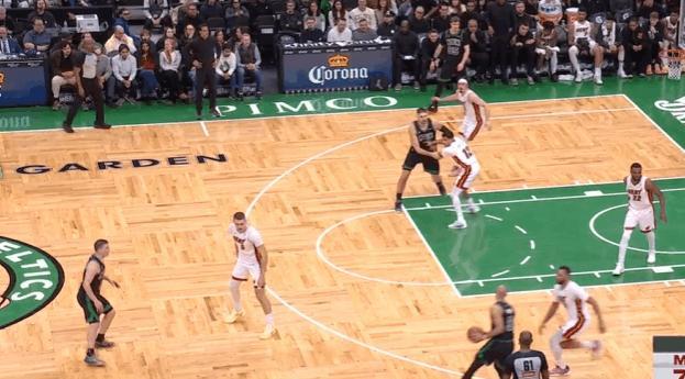 P7哈克斯执行“事后换防”保护史密斯,换防到武器后选择绕前防接球但直接被怀特的反吊篮下反制。武器摆脱哈克斯接到球后轻松将球放进篮筐,打穿热火篮下。