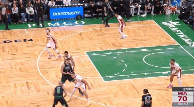 P4布朗传出高弧线反吊找到低位拥有错位优势的武切维奇,武器空中接球的同时扭头观察到弱侧执行45Cut接应的怀特,落地后顶着双人夹击立即传球找到——为自己解套、惩罚热火夹击。