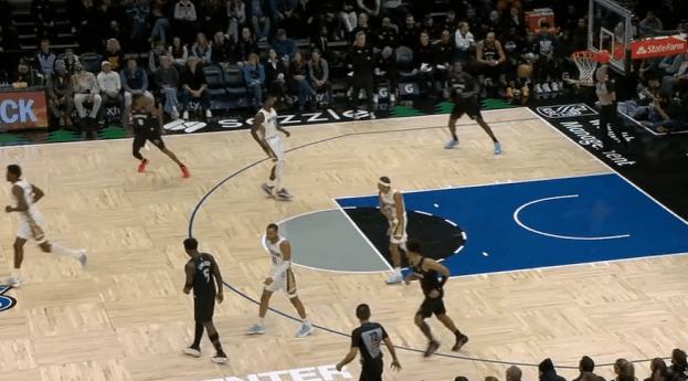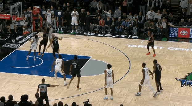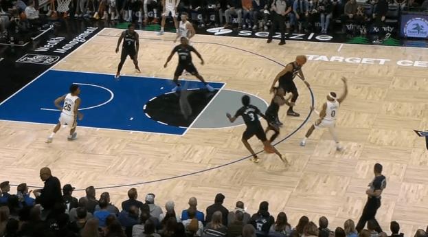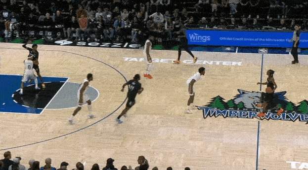 P5森林狼抢发底线球,海兰德快攻最前线接里德上球后急停突施冷箭,超远追身三分手起刀落,打鹈鹕一个措手不及。