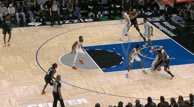 P4海兰德LOGO位置持球操刀挡拆,借戈贝尔掩护摆脱菲尔斯后见米西不断后撤,于是使用横撤步和追防人进一步拉开距离后——坚决出手持球三分予以打击。