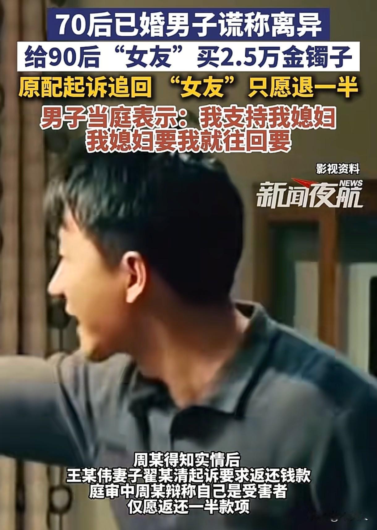 辽宁锦州,女子认识一男子,男子说自己离婚了,和女子确定了恋爱关系,并花25000余元给女子买了一只黄金手镯。可没过几天,男人妻子就找到女子,说他们夫妻只是分居,没有离婚,要求女子把金镯子还回去。女子称自己也是受害者,只愿意返还一半。可男子却说:我不愿意承担另一半,我花的就是夫妻共同财产,我媳妇让我往回要,我听我媳妇的。法院判决让女子欲哭无泪。 2025年7月,35岁的周女士在棋牌室打牌时,认识了1972年出生的男子王某。 两人认识之后,王某跟周女士说自己离异单身,一个人过日子冷冷清清的,就想找个知冷知热的人一起过日子。 周女士听后,觉得眼前这个男人挺实在的,两人一见如故,很快就确定了恋爱关系。 恋爱后,王某为了表达自己对周女士的爱意,同年8月,他将周女士带到一家金店,花25000余元给她买了一个金镯子。 周女士看着那金镯子,心里乐开了花,觉得自己终于找到了那个真心对自己好的人。 不曾想到,这幸福的日子还没过几天,周女士就接到了一个陌生电话,对方自称是王某的妻子瞿某。 她和周女士说,自己并未跟王某离婚,他们只是分居而已。 她要求周女士把金镯子还回去,自己可以当什么都没发生过。 周女士傻眼了,王某明明跟她说,他已经离婚了的,怎么又冒出来一个妻子,自己怎么就稀里糊涂的介入了别人的婚姻。 她越想越气,觉得自己也是受害者,凭什么对方要求自己还就得还,她拒绝了瞿某的要求。 可瞿某哪肯善罢甘休,她一纸诉状将周女士告上了法庭,要求周女士返还购买金镯子的25000余元。 上了法庭,周女士表示自己是被王某所欺骗了,王某的行为给自己造成了巨大的伤害,还损害了自己的名誉,应该给予赔偿,金镯子已经丢了,但是自己愿意返还一半的钱款给对方,也就是12506元。 可没想到王某却表示自己不愿意承担另一半,他花的就是夫妻共同财产,现在他媳妇让他往回要,他就往回要,他支持自己媳妇的决定。 周女士怎么都没想到,这个曾经对自己甜言蜜语的男人,如今竟然如此绝情,把所有的责任都推得一干二净。 法院的判决更是让周女士欲哭无泪。 法院审理后认为:王某在与瞿某婚姻存续期间,将夫妻共同财产赠与给周女士,这种赠与行为违背了公序良俗,是无效的。 《民法典》第8条规定:民事主体从事民事活动,不得违反法律,不得违背公序良俗。 王某在有家庭的情况,跟周女士发展为不正当男女关系,这种行为违背了夫妻忠实义务,也违背了公序良俗。 夫妻在婚姻关系存续期间所得的财产,为夫妻的共同财产,归夫妻共同所有,双方有平等的处理权。 他未经妻子瞿某同意,擅自将夫妻共同财产赠与给周女士,侵犯了瞿某对夫妻共同财产的合法权益,这种赠与行为无效。 可周女士却声称金镯子丢了,法院综合考虑后,判决她返还25000余元给瞿某。 一审判决后,周女士不服,提起了上诉,二审维持了原判,除了要返还25000余元给瞿某外,二审受理费还需周女士承担。 有人说估计是男方送完金镯子后,又后悔了,不好直接要,就把事情告诉给自己妻子,让自己妻子找女方要回来。 无论是王某主动告诉给妻子的,还是他妻子自己发现的这件事情,王某的所作所为都是不道德的。 王某在和妻子没有离婚的情况下,谎称自己离异单身,骗取周女士的信任,和她确立恋爱关系。 事情败露后,又把责任撇得一干二净,这个男人三观、人品都是有问题的,他的所作所为,理应受到谴责。 男女双方,在恋爱交往过程中,一定要擦亮眼睛,先去了解清楚对方的为人,再进行下一步,不要急着把自己的一切都给对方。 关注@木头人 ,从法律角度看世界,感受不一样的人情冷暖。
