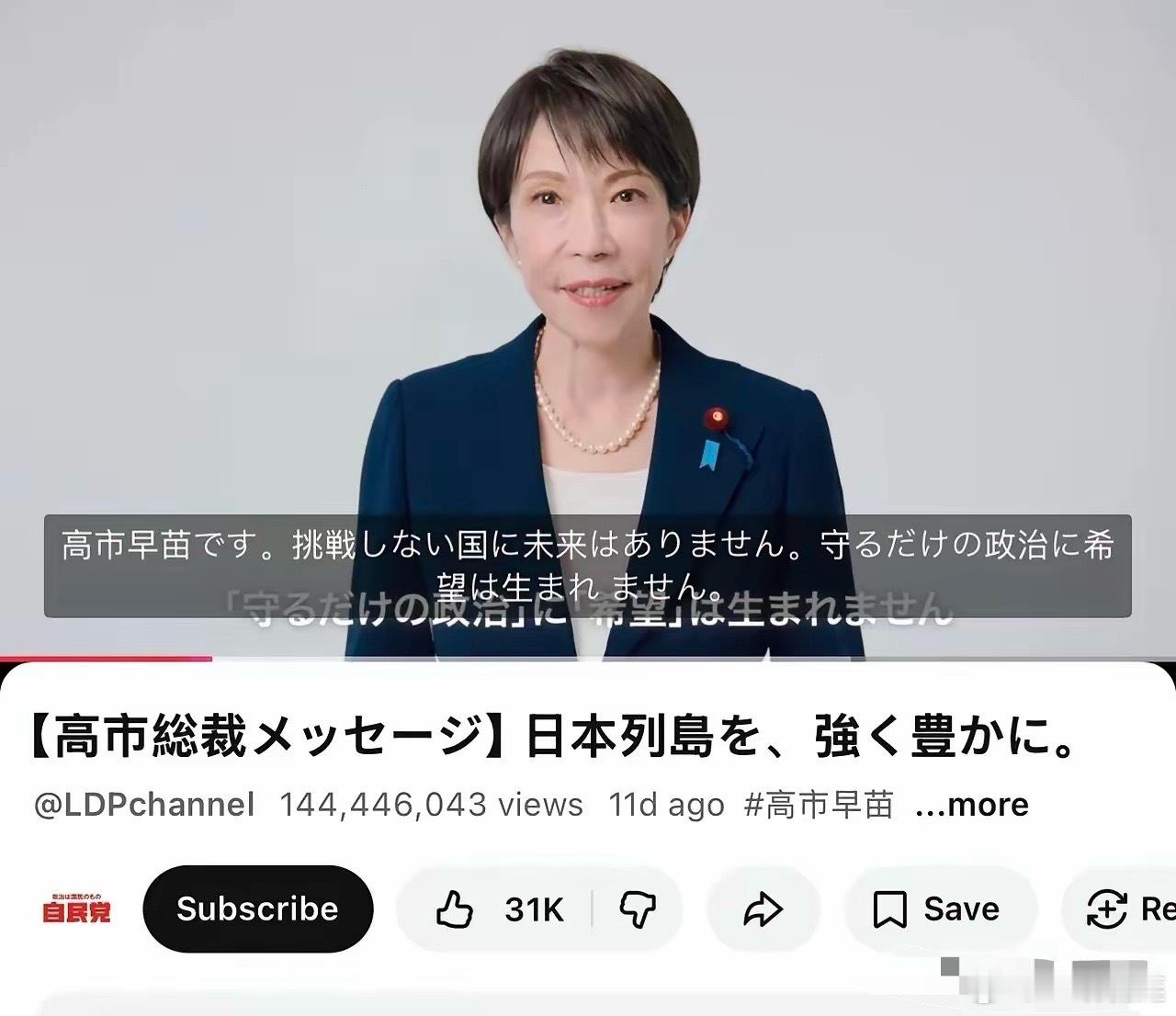 高市早苗到底说了什么,短短的30秒竞选宣传视频,竟然突破1.44亿观看量,超过日本1.22亿的总人口!在宣传视频中,高市早苗说,日本如果政治守旧、不敢挑战,就不会有出路和未来。为此,高市早苗表示,自民党会站在最前面,不逃避、不动摇,让日本列岛变得强大而富裕。可以看得出来,高市早苗继续以其狂热的右翼军国主义煽动日本群众。饼是画得真大,头脑发热的日本人也不少。但现在无脑的狂欢,已然注定其悲催的结局!