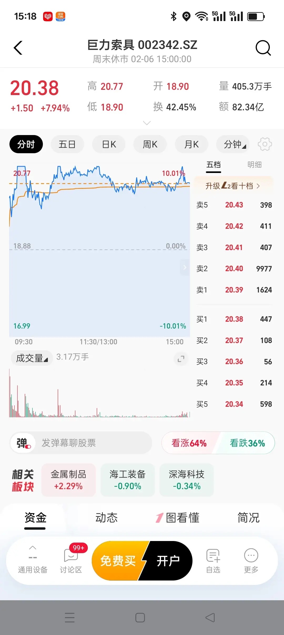 📈 巨力索具(002342.SZ)2月6日盘后速览这是巨力索具(002342.SZ)在2月6日的行情界面,当日股价强势冲高,延续了近期的上涨趋势。✨ 核心行情数据- 收盘价:20.38元,涨幅7.94%- 成交量:405.3万手,成交额82.34亿元- 换手率:42.45%,显示资金交易极为活跃- 分时走势:早盘平开高走,冲高至20.77元后震荡整理,最终收于20.38元,日内振幅达9.59%🚀 上涨驱动因素1. 海上风电需求爆发:公司作为国内海工装备索具龙头,深度受益于海上风电装机量的快速增长。2025年全球海上风电新增装机预计超60GW,同比增长超30%,带动相关设备需求。2. 技术壁垒与订单增长:公司掌握超深水脐带缆、动态缆等核心技术,相关产品已应用于全球最深1500米级海上风电项目,近期新签订单规模同比增长超50%。3. 资金抱团炒作:在市场热点轮动背景下,公司因“深海装备+风电”双重属性成为资金追捧标的,近5日累计涨幅超40%,换手率持续维持在40%以上。📊 资金情绪从盘面看,资金博弈激烈,股价在20元关口反复争夺,显示市场分歧较大。尽管未能封死涨停,但高位换手充分,多方力量仍占主导,后续需关注量能能否持续放大。