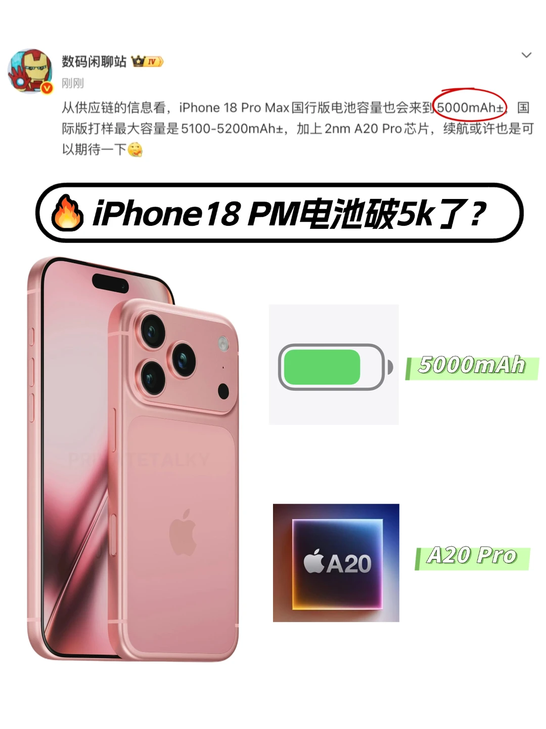数码闲聊站曝料iPhone18 Pro Max的电池达到了5000毫安时以上,[doge]虽然在国产机动辄10000毫安时电池面前显得有些不够看,但苹果有2nm的A20 Pro芯片和iOS两大省电法宝,实际续航可能会提升不少![暗中观察R]话说你们现在用iPhone有续航焦虑吗?