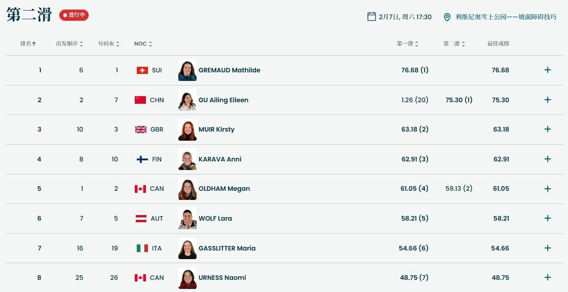 谷爱凌第二轮获75.3分,暂升自由式滑雪女子坡面障碍技巧预赛第2