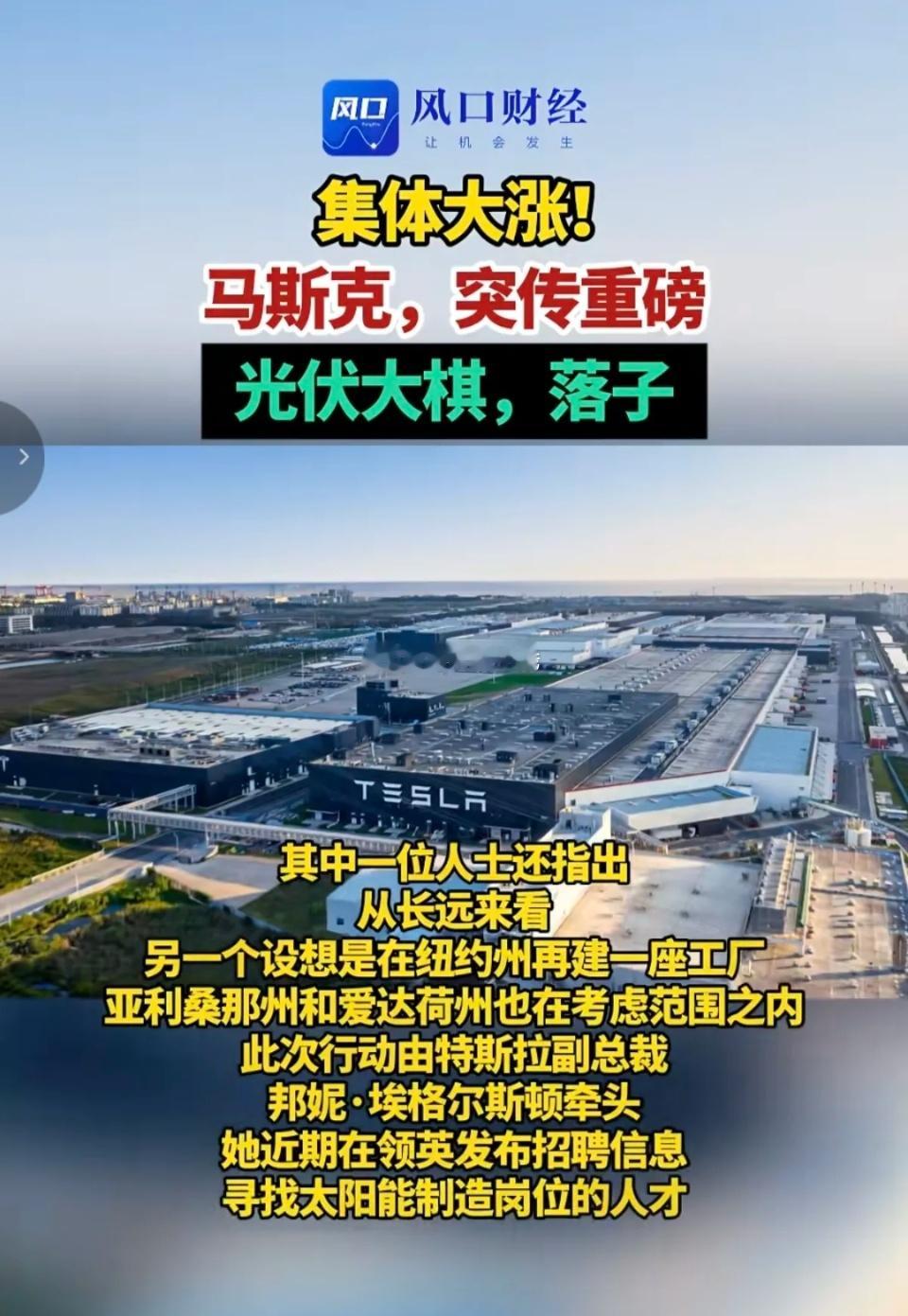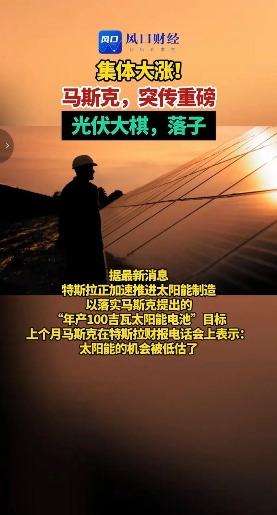 周五晚间,美股光伏概念股集体大涨!特斯拉正在加速推进太阳能制造,以落实马斯克提出的年产100GW太阳能电池。马斯克特斯拉