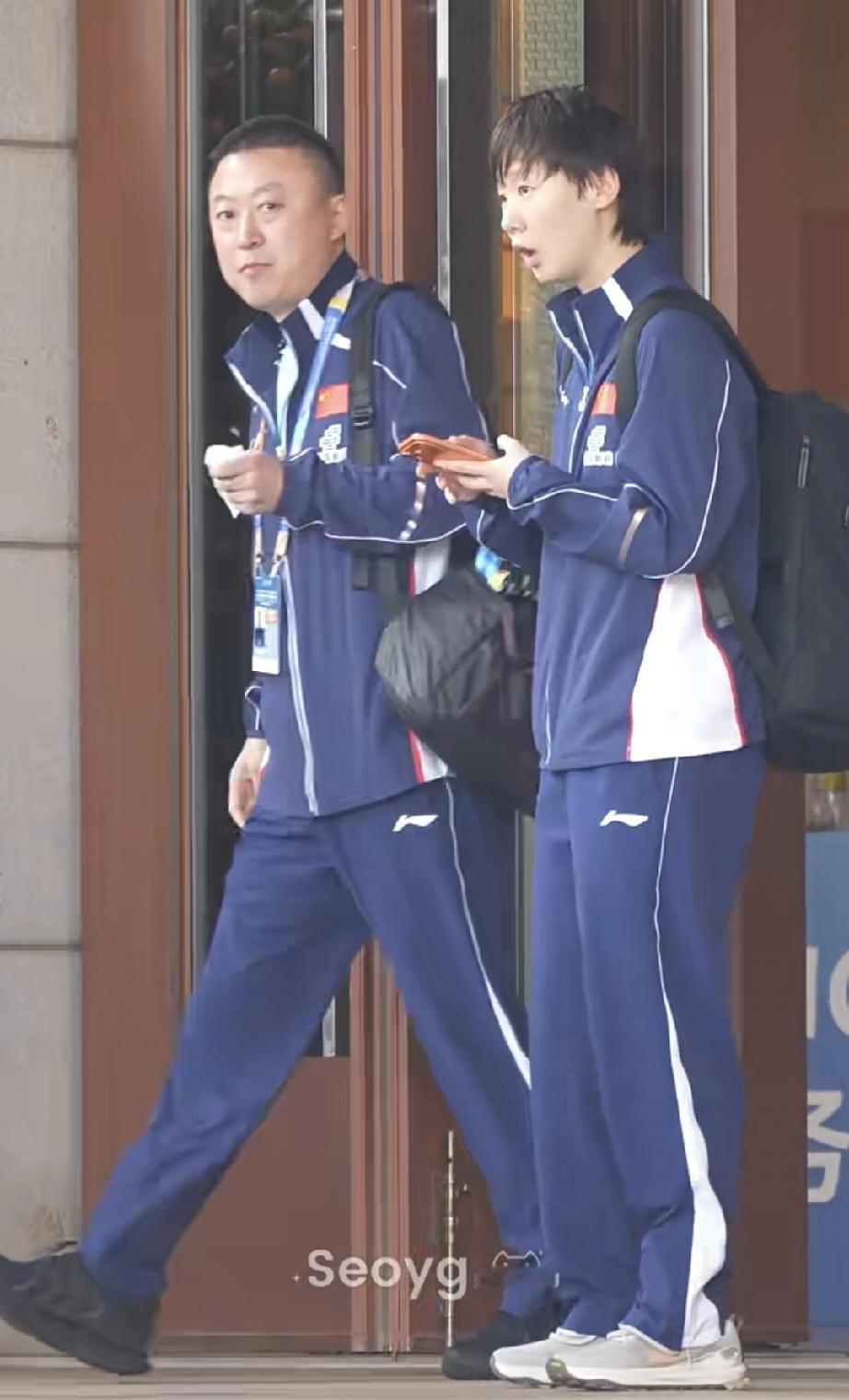 海口亚洲杯,王曼昱今日女单1/4决赛前从酒店出发上训。 终于看到任浩教练晚上不需要做别人场外指导,可以和王曼昱一起出发去训练馆啦! 马琳教练和孟队医也是必不可少。 这三个男人现在对球迷来说是重点盯梢对象,只要你们三个在,比赛就没问题!