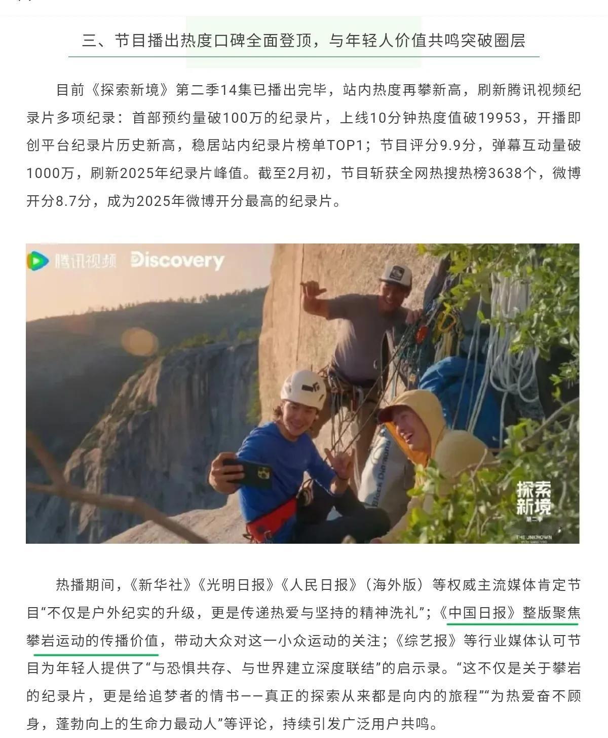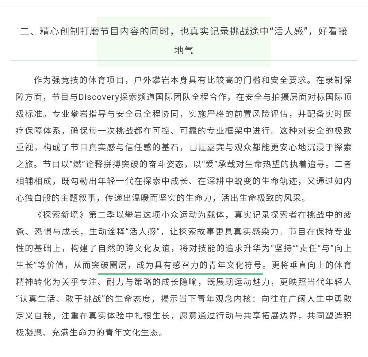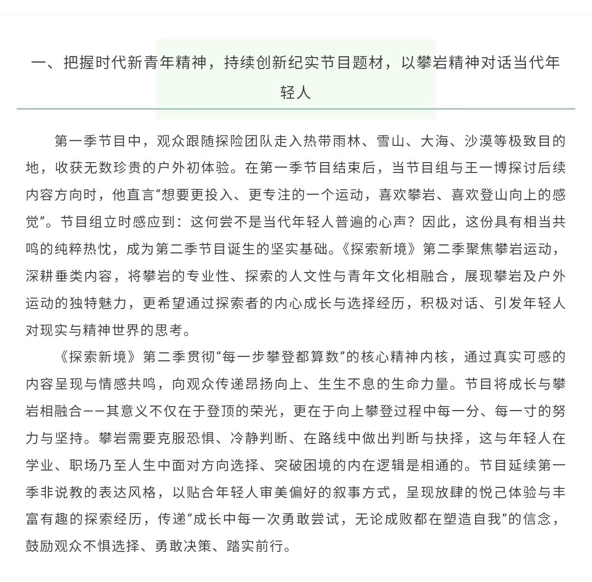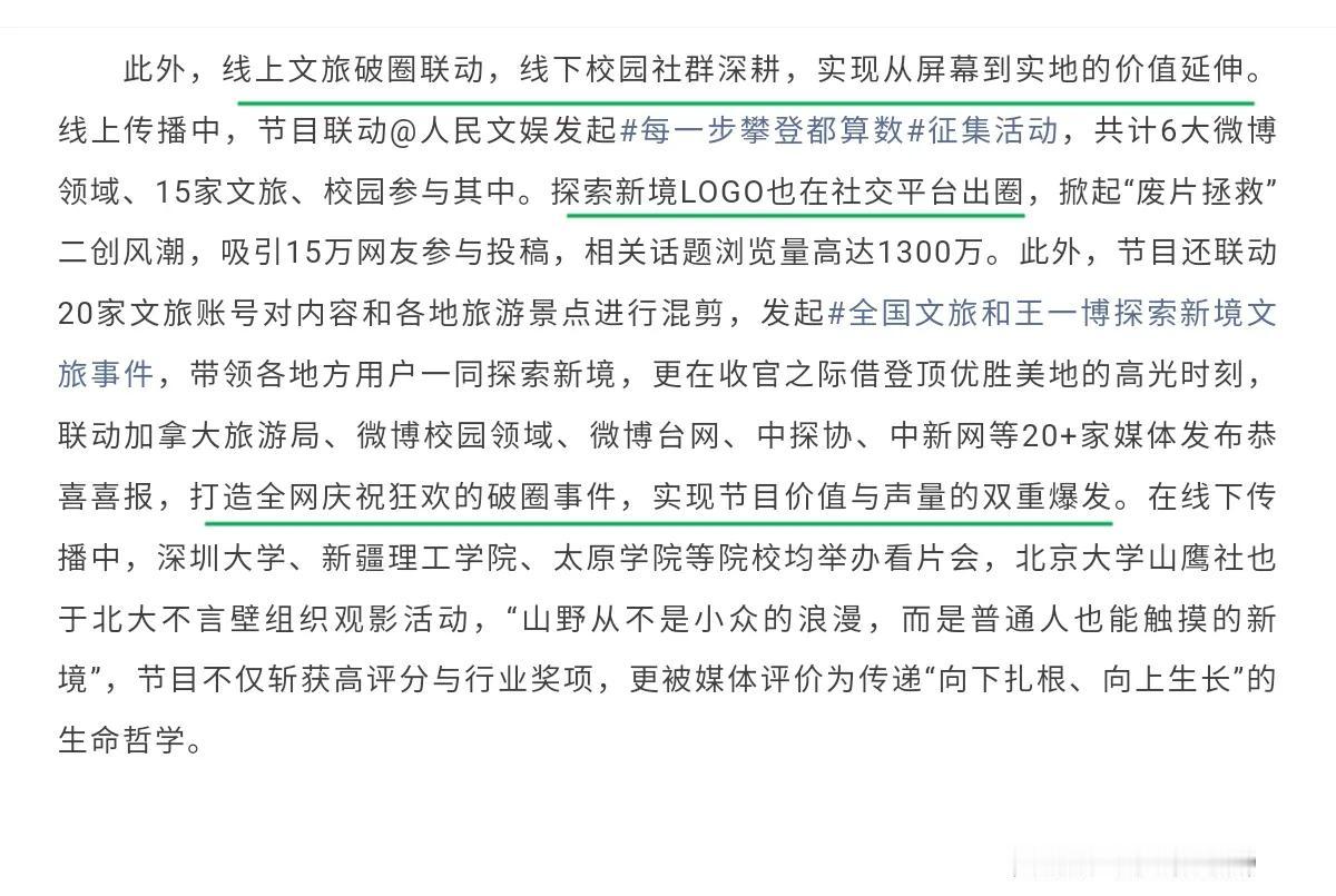 广电智库文艺评论探索新境2 ,全篇关键词:【共鸣、青年文化符号、破圈】。 官方认可探索新境2取得成功:探索新境2突破圈层,成为具有广泛共鸣的青年文化符号,热度口碑登顶。 文中多次提到节目破圈:线上文旅联动破圈、探索新境LOGO社交平台破圈、收官之际全网庆祝狂欢破圈,节目价值与声量双重爆发。 王一博了不起,他的粉丝也超厉害,LOGO破圈就是王一博粉丝首创和带动的。这必将成为各方研究的市场传播成功案例。 王一博与粉丝的相互促进,也是内娱的正能量偶像正向引领粉丝的模范样板。[赞]
