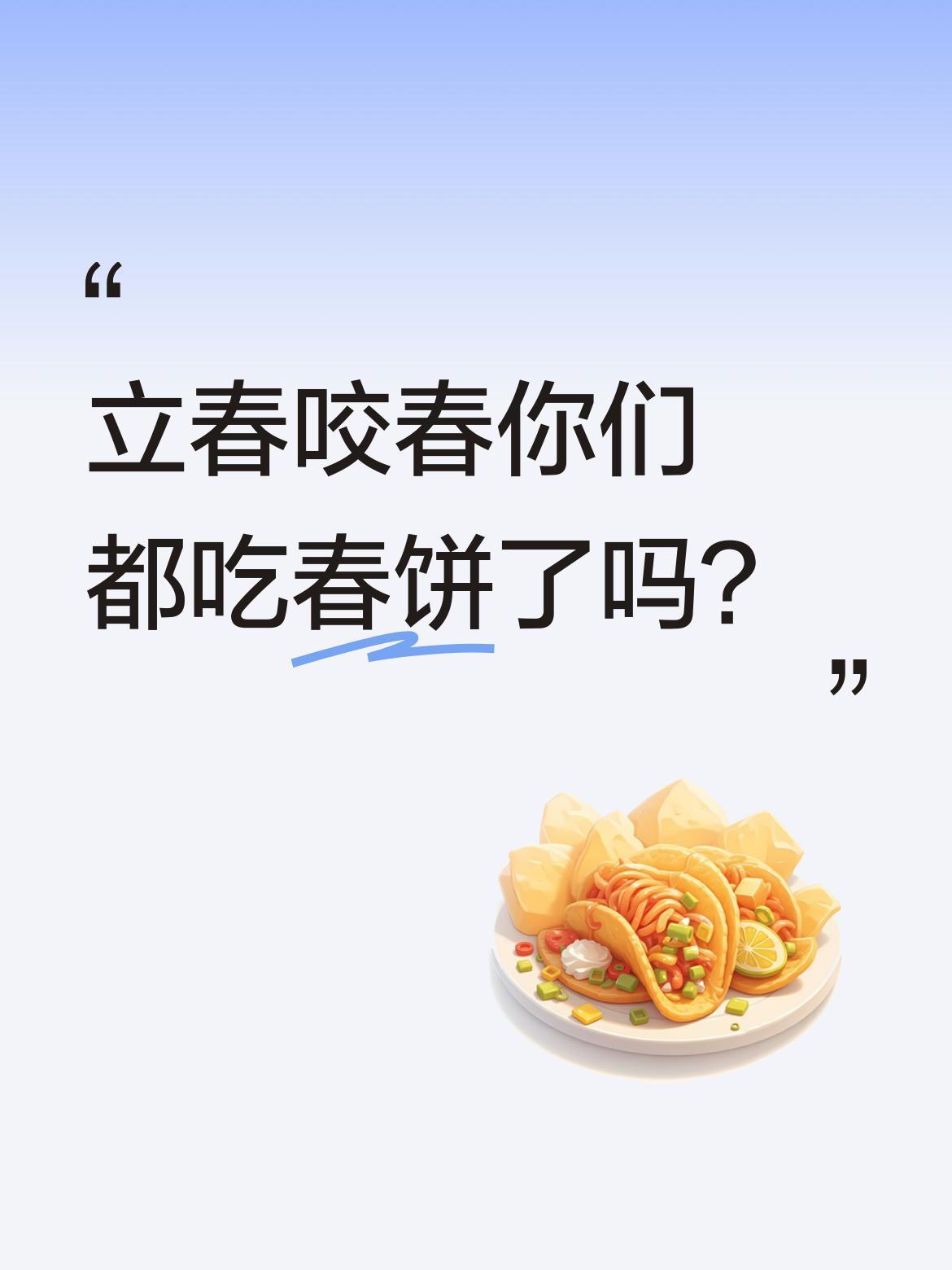 立春咬春你们都吃春饼了吗? "晨起咬春归,春饼卷芳菲",这首五绝道出了传统节气的仪式感。春饼里裹着的不仅是时令蔬菜,更是对春天的期待。有人偏爱经典的韭菜鸡蛋,有人喜欢加嫩炒肉丝,还有人会配上清爽的黄瓜丝。 你们家咬春有什么特别讲究?春饼里必不可少的配菜是什么?评论区分享你的"卷春秘方"吧!