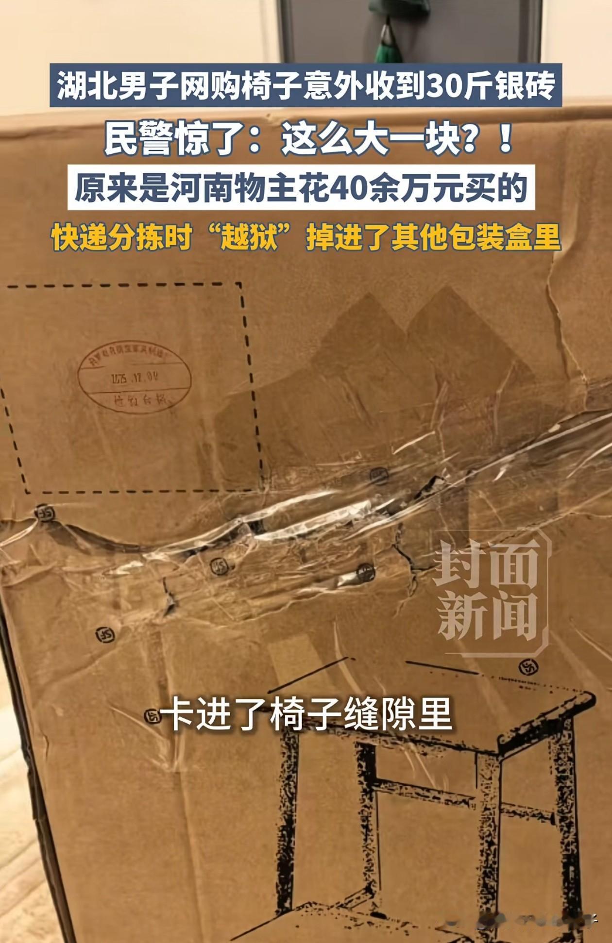 好消息:丢的银砖找回来了, 坏消息:银的价格已经跌停了! 近日,河南一男子花40万网购了一块银砖,原本2天前就该到货,可物流信息却迟迟没有更新,男子很着急,不停打电话催促快递员,可始终找不到包裹。 另一边,湖北一男子网购了一把椅子,拆开却发现,箱子里还多了一件“神秘快递”,打开一看,竟是一块重达30斤的银砖,他担心失主着急,立刻选择报警。 快递站点调取监控后才发现,原来是因为这块银砖分量太重,分拣时不慎戳破了湖北男子的快递箱,直接掉进了对方购买的椅子缝隙里。 最终,银砖顺利物归原主,只是刚找回就遇上银价跌停,也是让人哭笑不得。 有网友说,男子也不知道是该哭还是该笑,要是早两天拿到,也不至于亏这么多!