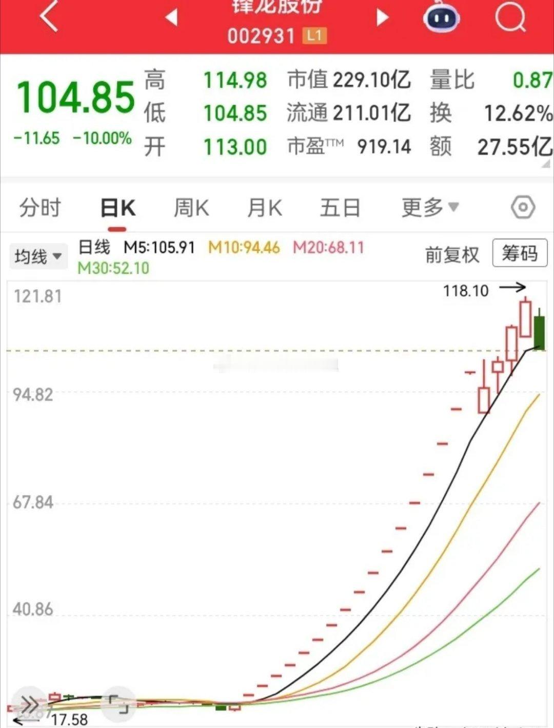20多个涨停,从17块飞到100多块,几乎快10倍的高度。这种神仙走势,突然在高空走出一个大阴线,打得多头们一个措手不及。这是要开始多变空了吗?有一说一,庄就算有再大的力量,面对如此高的一个位置,恐怕也有一点儿力不从心了。毕竟这是一个接近十倍的走势,如果基本面不能及时跟上去的话,很容易就会造成走势高位的坍塌。靠蛮力强拉上去的走势,顶多只能维持一小段时间,如果没有源源不断的动力持续注入,很快就会有很多在里面的多头,自己会率先转变成空头,抢着要先跑出去了。这又将进一步加剧了走势的下行动力,最终实在承接不住太多的抛压力量之后,走势就会面临多变空的反转。目前看来,的确有往这方面的一个可能性。走势已经向下靠近了五日均线的位置,后面如果继续下行,将完全打破现阶段的上行通道以及各均线的支撑位,这在技术指标层面是不太好看的。所以对于当前情况,而是要多加留意才行。