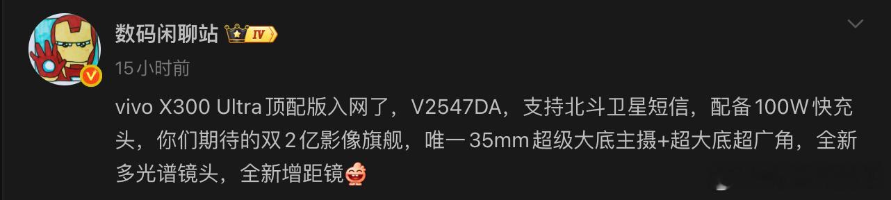 vivo X300 Ultra 顶配版正式入网了,咱就是说这影像堆料直接封神!双 2 亿像素主摄 + 唯一 35mm 超级大底,还有全新多光谱镜头,北斗卫星短信也安排上了,充电还是 100W 快充,影像和实用性直接拉满!之前 X300 Pro 卖爆不是没原因的,这次 Ultra 版直接拉满配置,妥妥的年度影像旗舰预定!有没有蹲 vivo X300 Ultra 首发的摄影党?你们最期待它的哪个拍照功能?