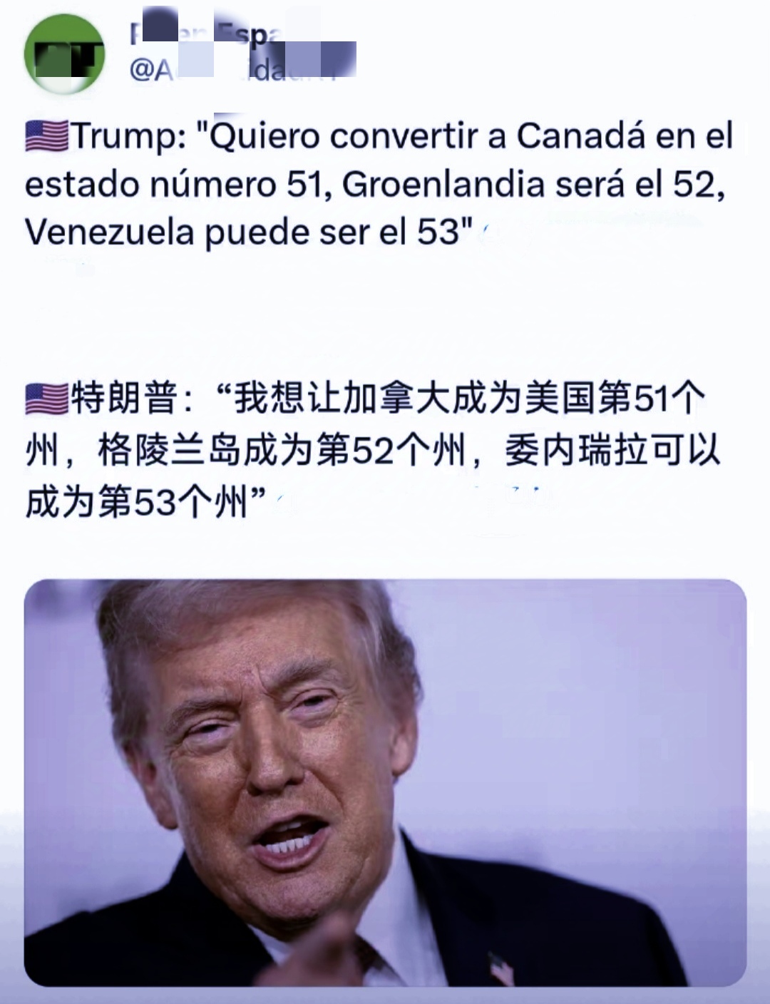 美总统:让加拿大成为美国第51个州,格陵兰岛成为第52个州,委内瑞拉成为第53个州。