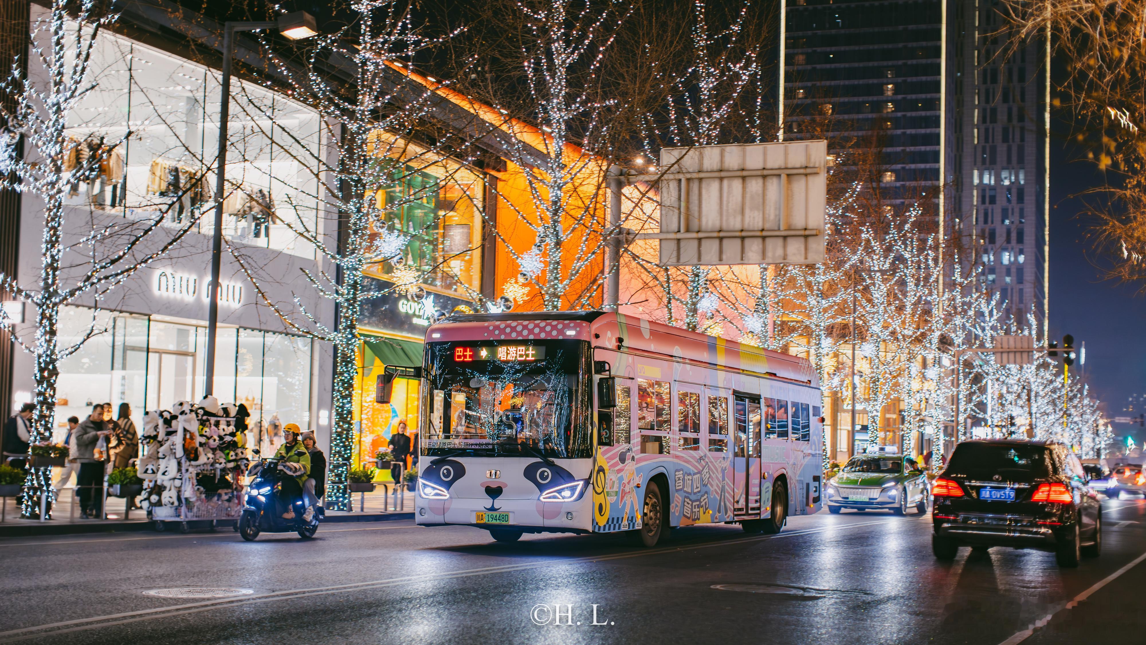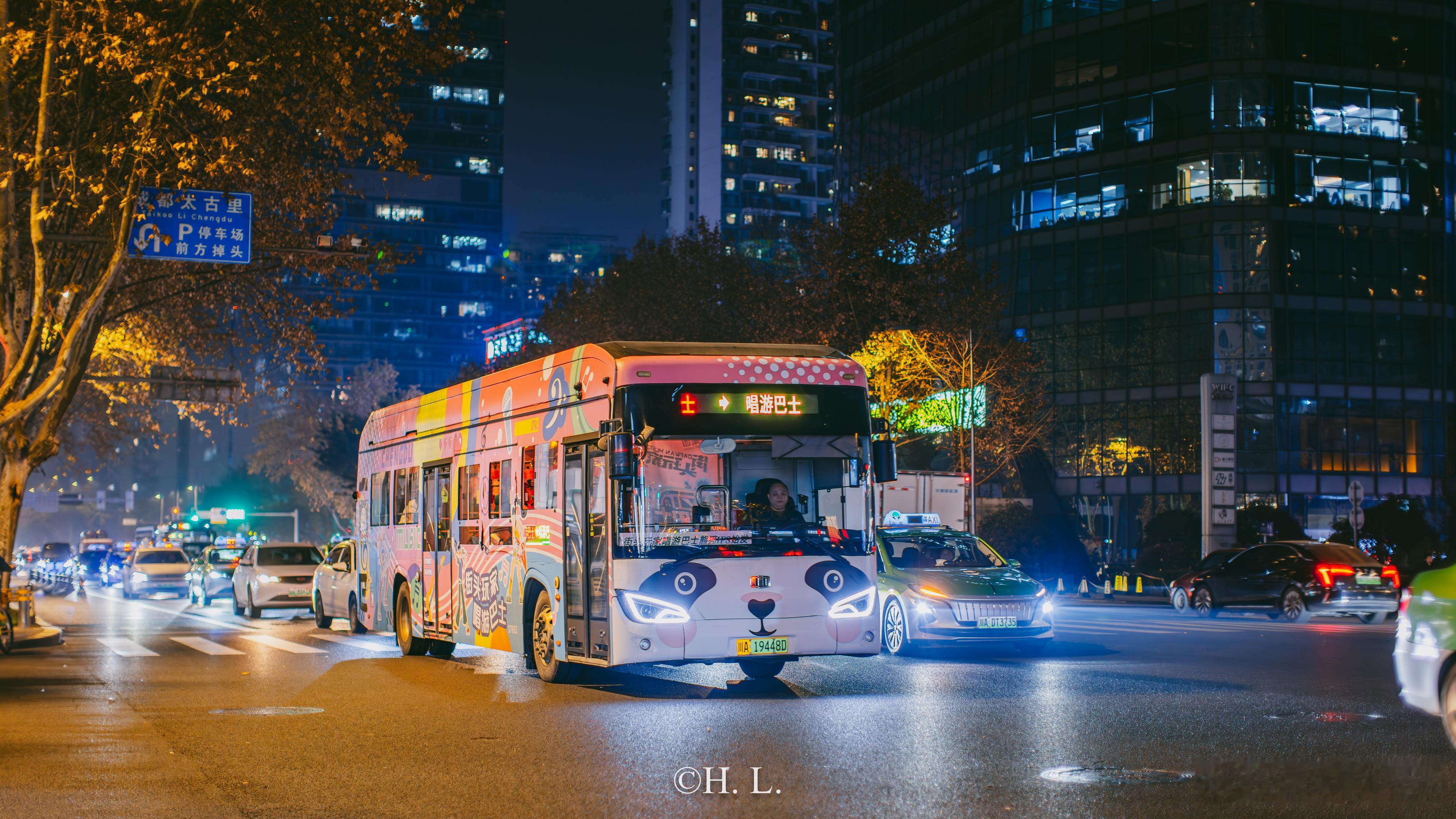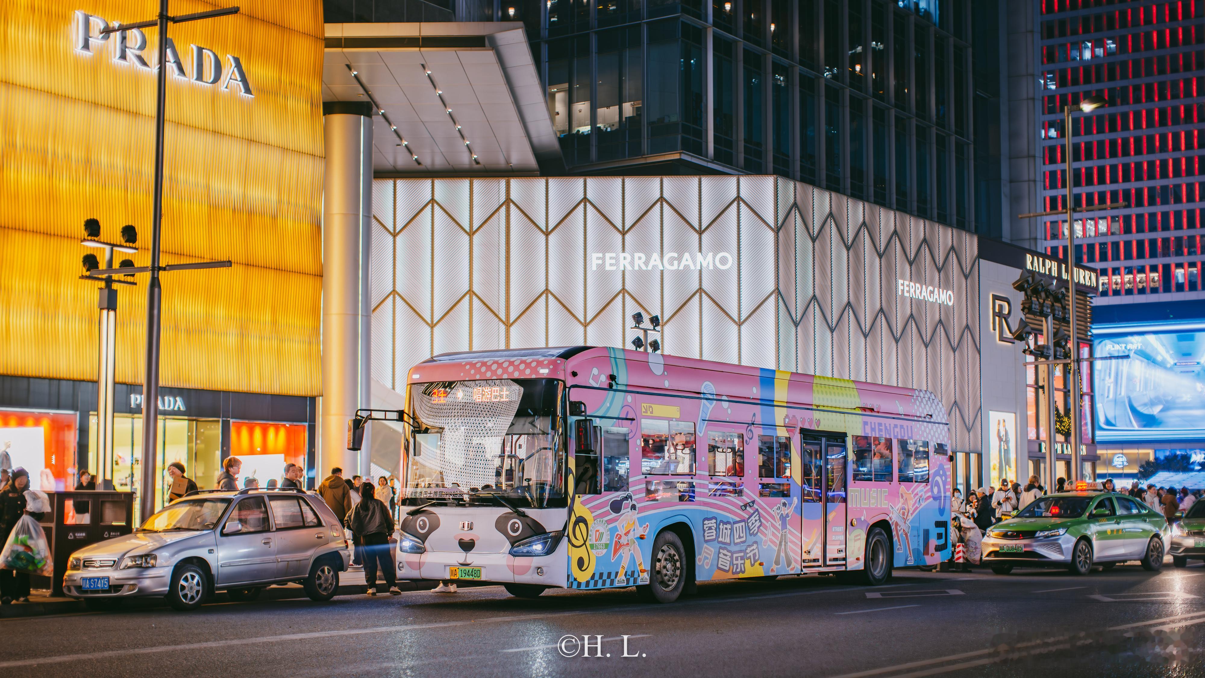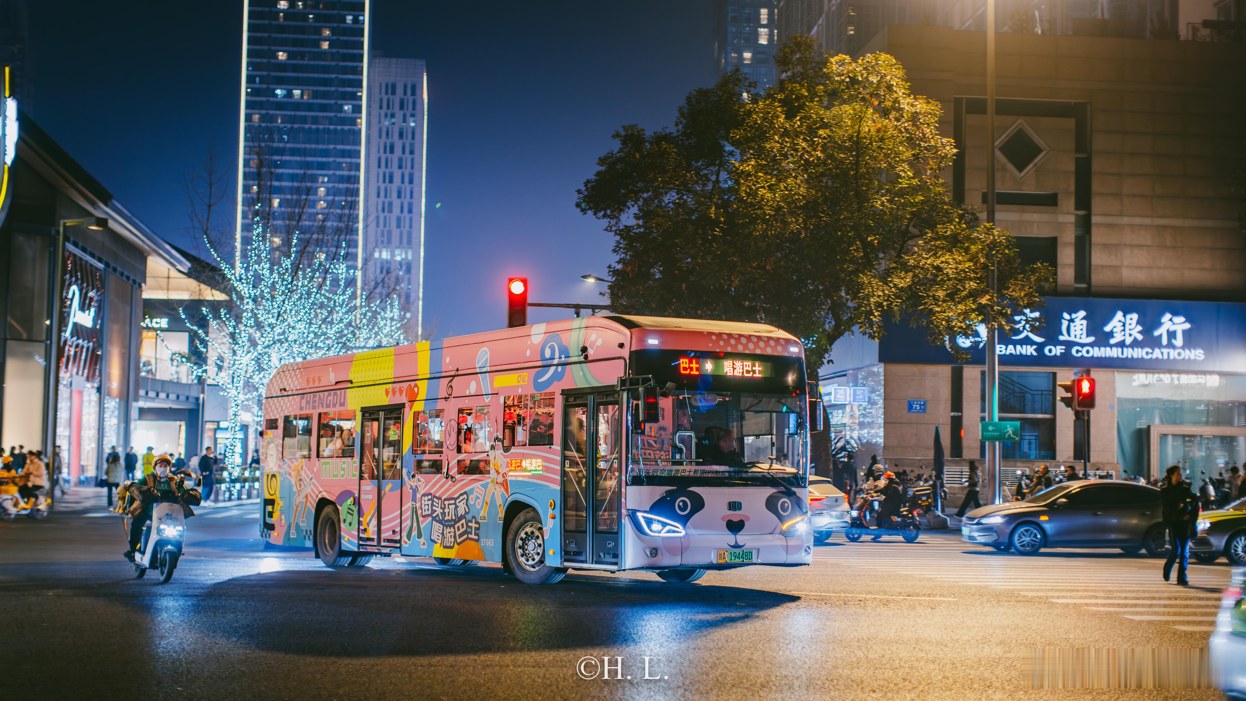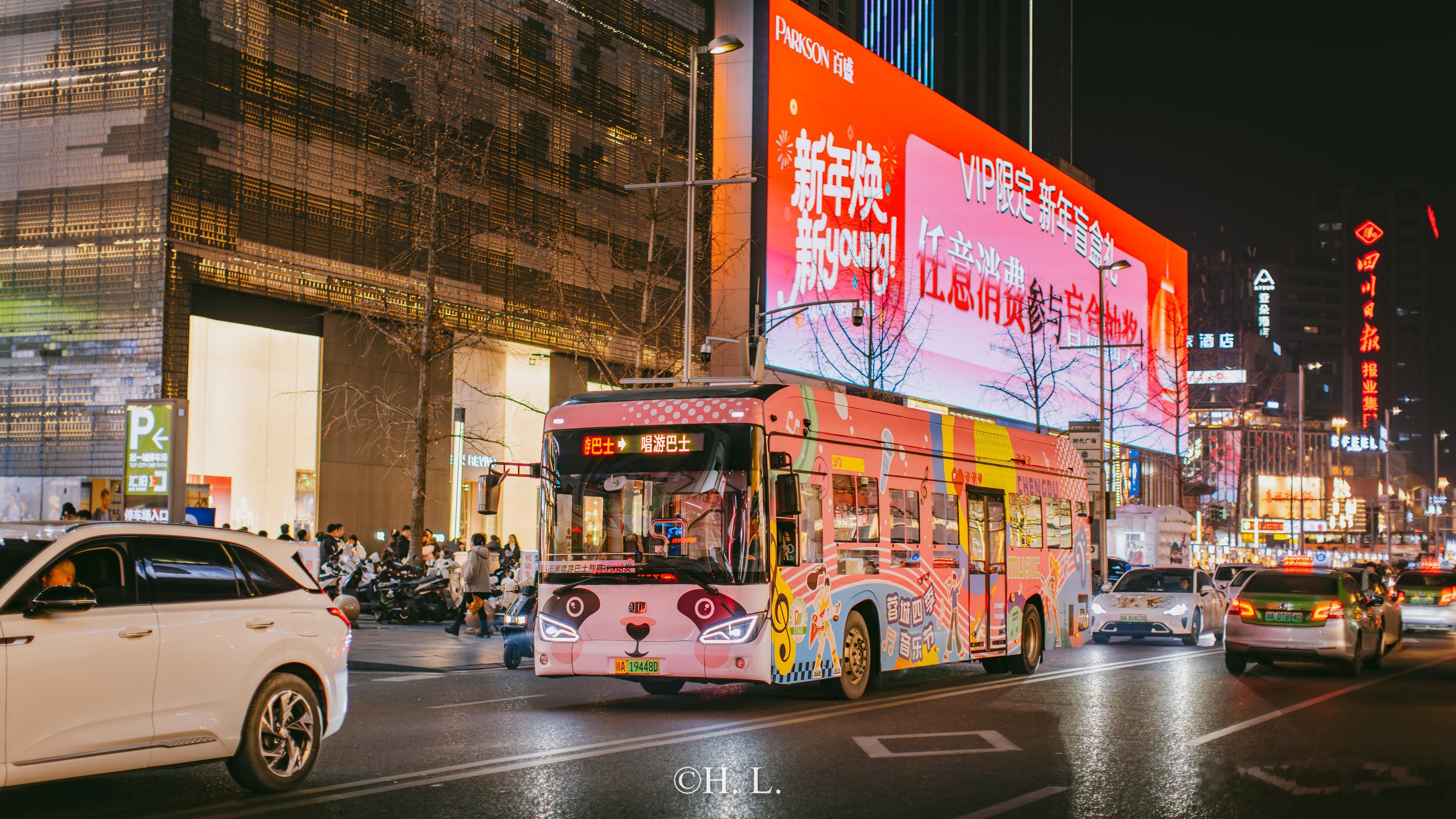 四川成都的唱游巴士粉底色,颇有设计感的全身车衣。