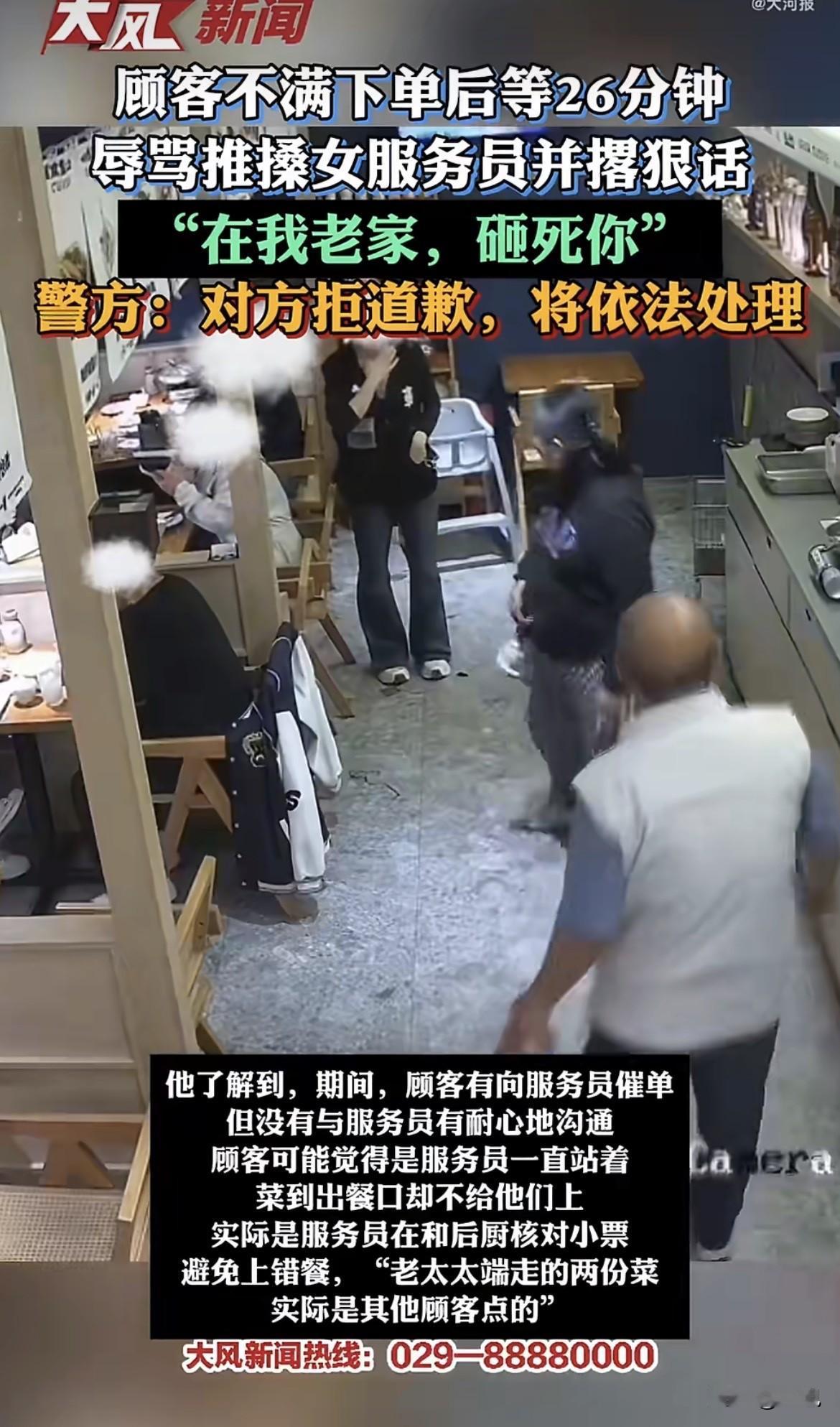 2026年2月5日晚上7点47分,深圳一家餐厅的出餐口,一个女服务员站着。她没玩手机,也没闲着,是在等菜,顺便和后厨核对手里的小票。这是她的工作,怕上错了桌。 突然,一个东西飞过来,擦着她,或者就是冲着她去的,砸在了旁边的货架上。一个1.5升的大酒瓶应声落地,“砰”一声碎了,酒洒了一地。扔东西的是店里一桌客人中的一位女士,因为等菜等急了。 这桌客人有老有小,两个老人,一位女子,一个孩子。他们是在26分钟前,也就是晚7点21分扫的码,点了10个菜,总共246块钱。据华商报大风新闻报道,那天是年前,店里本来该有4个服务员,结果一个提前回老家,一个调休,只剩两个人在忙。正是晚高峰,店坐满了,外卖单子也多。 冲突不是突然炸开的。在这26分钟里,老人已经自己去出餐口端走过两盘菜。可那菜是别人的,不是他们桌的。服务员当时没阻止吗?可能没来得及,也可能她在核对,怕的就是端错。但在老人眼里,这成了“磨时间”的证据。 酒瓶碎了之后,一个老人指着服务员骂,话很刺耳:“要在我老家,砸死你。” 另一个老太太走上来,边说“你就在这里站着不动”,边伸手推在了服务员的脖子上。服务员没还嘴,也没还手。 店里的刘老板后来才知道这些细节。他挺难受,因为那个服务员小姑娘,是家里七个姐妹里的老二,很懂事。她之前已经因为妹妹生病提了辞职,那天原本是她最后一天上班。在派出所,她吓得哭了半个多小时。 刘老板报了警,态度很明确:砸东西、骂人、推人,不和解。他们就想要句道歉。但警方联系上那位动手的老太太,对方拒绝道歉。 深圳公安罗湖分局的人说,这事“超过了合法维权的限度”,肯定违法了。他们已经做了笔录,要交给法制部门去定性,然后按《治安管理处罚法》来处理。 事情就这么摆着了。从等一桌菜,到等一个道歉,后者看起来,好像比前者还要难。 你说,这事儿问题到底出在哪儿?