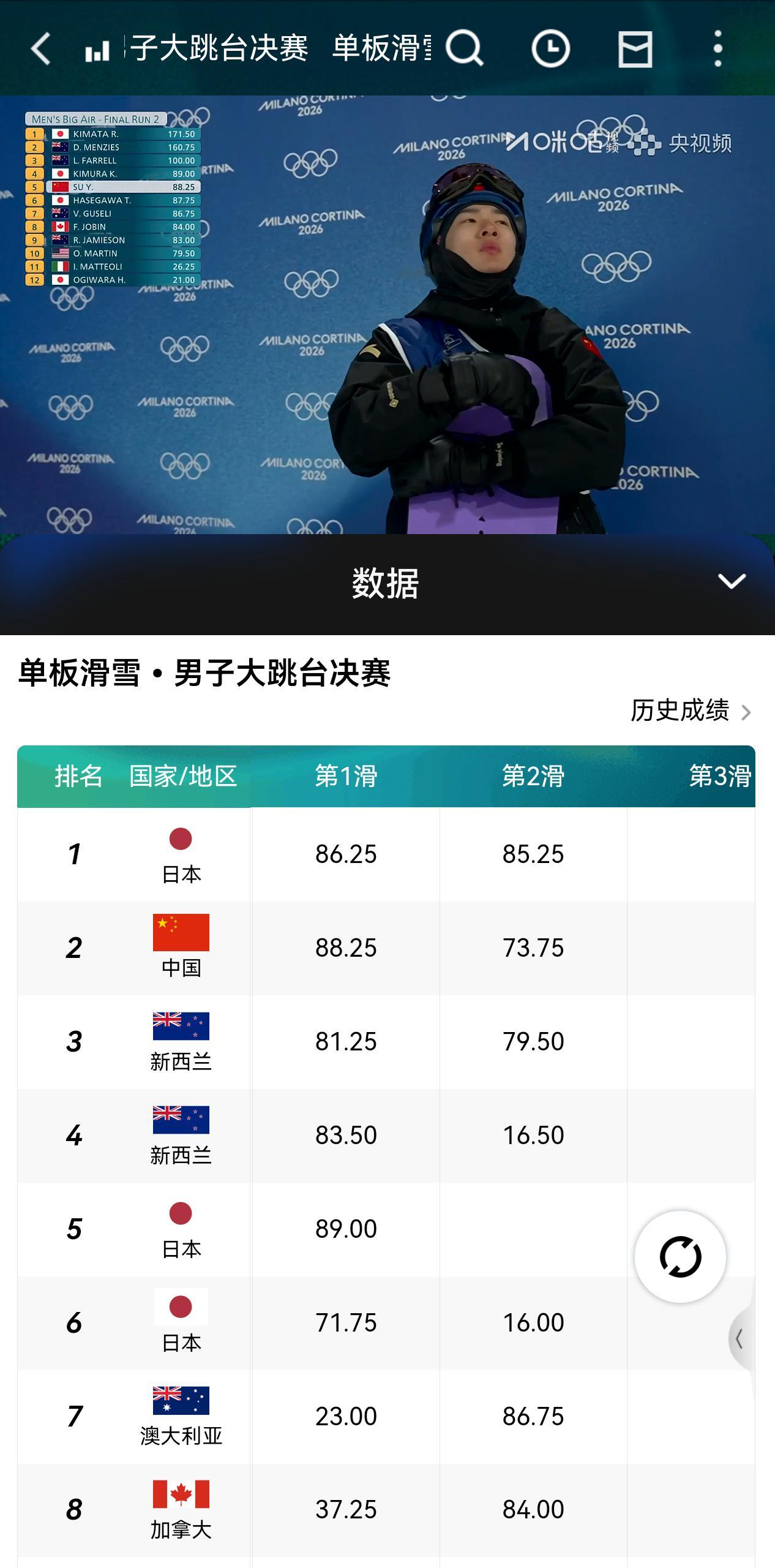苏翊鸣第二滑73.75分。不是很理想,不过没关系,他还有一次机会。因为这个比赛是三滑当中取两个最高分相加得到总分的,所以只要他第三滑滑好,成绩浮动还是会很大的。全民聊冬奥 苏翊鸣决赛 单板滑雪决赛