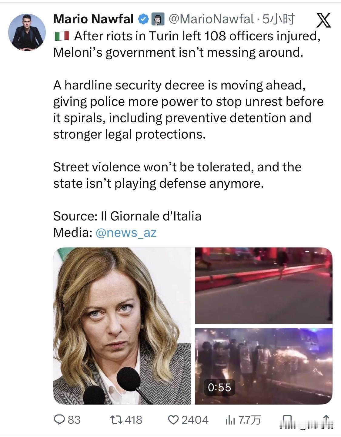 意大利梅洛尼(Giorgia Meloni)政府近期批准了一项严厉的新安全法令,以应对 2026 年 2 月初在都灵发生的暴力骚乱。该骚乱导致 108 名执法人员受伤,并伴随针对警察的极端暴力行为。 以下是该法令的核心内容及措施: 预防性拘留与警权扩张 为了在抗议活动演变成骚乱前进行干预,新法令引入了多项强硬措施: 预防性拘留(预防性禁令): 警方被授权在示威活动开始前,对被视为“公共安全威胁”的可疑分子进行最长 12 小时 的临时拘留。 法律保护与自卫: 扩大了对警察在执勤时使用武器自卫后的法律保护,使其在接受调查时拥有更强的保障。此外,新政还增加了针对袭击制服人员行为的刑罚。 禁止参加示威: 司法部门有权禁止曾因暴力事件被定罪,或在抗议中携带武器、头盔、棍棒等物品的公民参加示威活动。 违禁品打击: 禁止向未成年人销售任何可能造成伤害的器具,并对携带刀具等利器的行为实施严厉打击。 都灵骚乱背景 该法令的加速推进直接源于 2026 年 2 月 1 日在都灵发生的严重暴力冲突: 骚乱原因: 抗议活动起因于数万名示威者支持被驱逐的无政府主义社会中心 Askatasuna,抗议者与警方展开了数小时的街头战斗。 极端暴力: 一名 29 岁的警察(Alessandro Calista)被戴面具的抗议者包围并被用锤子多次击打,梅洛尼将此定性为“谋杀未遂”。 人员伤亡: 共有 108 名安全人员受伤,其中包括 96 名警察、7 名财务警察和 5 名宪兵。 政治反响与时机 冬奥会安保: 该法令的通过正值 2026 年米兰-科尔蒂纳丹佩佐冬奥会 开幕前夕。意大利政府希望通过加强管控,防止针对冬奥会(如针对美国移民和海关执法局人员存在)的抗议活动失控。 反对派批评: 中左翼反对派强烈谴责这些措施,称其为“镇压性”法律,认为 12 小时的预防性拘留严重侵犯了宪法赋予的示威自由。 生效机制: 作为一个政府法令,它在官方公报公布后立即生效,但必须在 60 天内获得议会支持才能获得永久法律效力。鉴于梅洛尼政府在议会占多数,该法案预计将顺利通过。