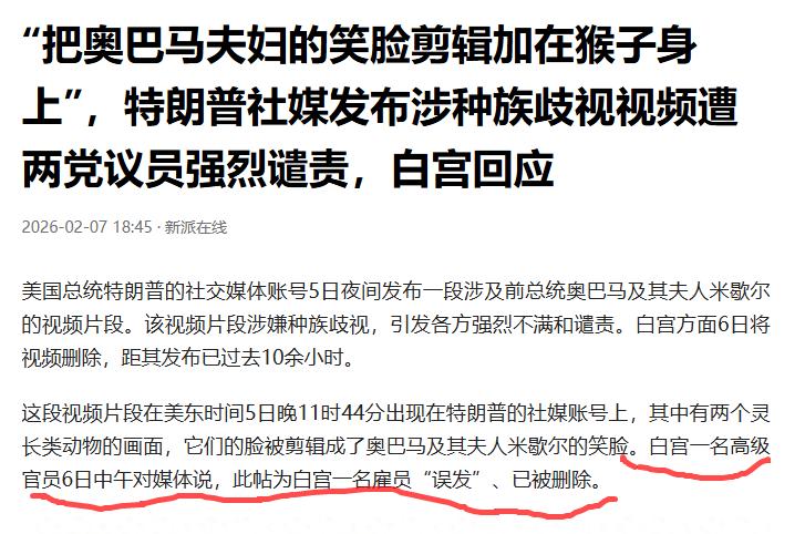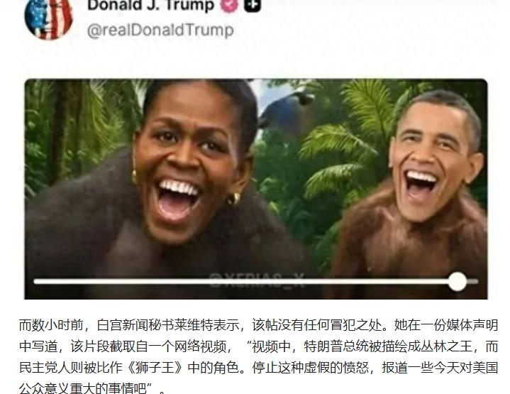 税宗这老头真的是从所欲啊,为所欲为啊。 反正也活不了几天了,还不如多做点让自己开心的事。[笑哭] 奥黑夫妇的头像配大猩猩的身子,这种事也真亏他能想得出来。 但这种剪辑的工作税宗自己肯定是做不来的。 所以,白宫也学到我们明星的社交精髓,手滑,工作人员发错了,反正都别人来背锅。 现在白宫已经把这个视频删了。 太可惜了,这么有趣的东西,都没有让大家一起来分享。[偷笑] 不过,不得不说,白宫新闻秘书莱维特真是厉害。 这种事她都能淡定地糊弄过去。[憨笑] 点右上角关注我,我们一起去看这个魔幻的世界