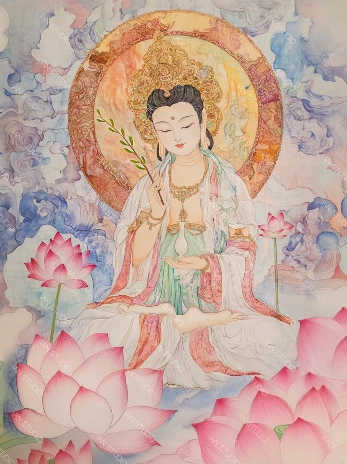 祈愿观音慈光遍洒,身心如莲承露,净润无扰;日常清宁似云栖月,安稳自在,所念皆顺遂,所往皆通途。