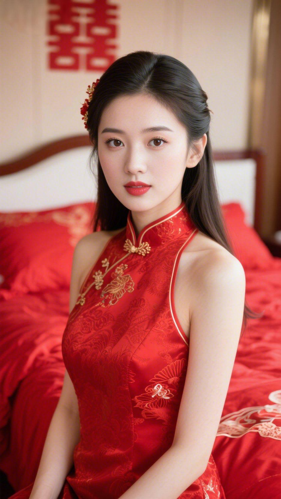 《红妆里的喜意柔》 暖光裹着“囍”字的红时,她像浸在了祥瑞的温软里。 正红裙装衬着舒展的肩,缎面的柔滑里,织着中式纹样的吉意。发间簪花轻垂,未刻意梳紧的发缕,藏着自然的柔和。襟前盘扣的金辉,裹着衣料的艳而不燥,连空气都似沾了点欢喜的轻甜。 她抬眼时神情舒展,没有刻意的姿态——这不是精心设计的模样,是吉时里的自在:不用拘谨身型,不用斟酌神情,连衣料的垂感,都成了此刻喜意的注脚。 原来中式红妆的美从不是用力的艳,是像这暖光里的囍字一样,红得郑重,柔得舒展。 中式红妆韵 喜意氛围感