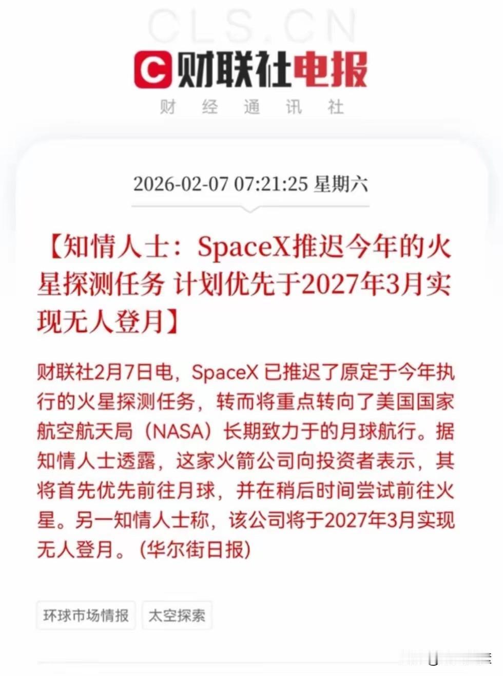 周末商业航天都是大消息:周一重新起飞,关注龙头 周末,关于商业航天都是大消息,既有国际的,又有国内的,一个指向:商业航天时不我待。 1️⃣2月7日约11:55,酒泉卫星发射中心成功发射一型可重复使用试验航天器,由长征二号F改进型火箭送入预定轨道,“成功”、“可重复使用”,利好火箭配套、热防护材料与卫星应用等环节。 2️⃣SpaceX推迟2026年底火星任务原因是为了推进NASA登月任务,目标2027年3月实现无人登月,为后续载人登月打基础。这个是美国政府的项目,太空竞争从来就没有停止过。 3️⃣亚马逊2026年卫星发射计划确定:计划发射超20次,2027年超30次,持续推进星座组网。目前亚马逊低轨卫星项目已发射180颗。 4️⃣上海市“十五五”瞄准商业航天等新赛道,目标再造万亿级产业新增量。 5️⃣2月中旬的航天大事: 2月11日:长征十号甲试验火箭,关键回收验证 2月15日左右:力箭二号火箭首飞,低成本快响技术 2月中旬:智神星一号发射,部署卫星星座。 可以肯定,2026年是商业航天的放量元年,也是商业航天概念股业绩初步兑现元年,且超预期的可能性很大,早相信,早布局,不后悔。 免责声明:个人观点,不构成投资建议,股市有风险,投资需谨慎。