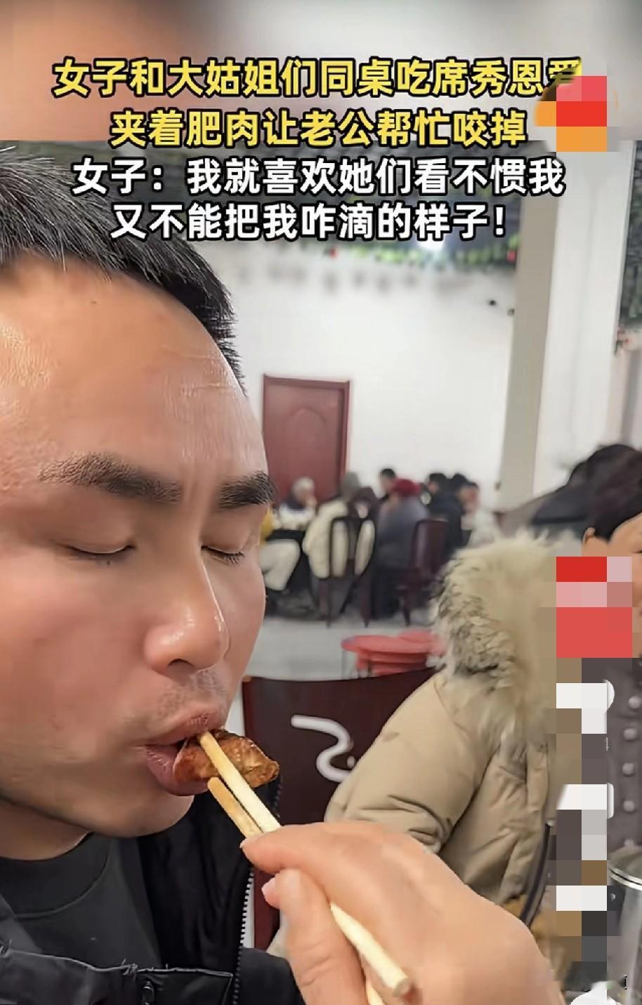 哈哈,逗死了。2月7日,山东。女子与老公和4个大姑姐去吃席,坐在一桌上了。 女子心想,机会来了。她夹起一块半肥半瘦的肉,递到老公嘴里,老公默契的帮她咬掉肥肉,女子洋洋得意的吃掉瘦肉。 这把四个大姑姐气的,一个个的甩脸色给女子看。 心想,我这小弟都是我们给咬掉肥肉给小弟吃的。 女子心里想的是,我就喜欢看你们不服又干不掉我的样子。 高,真高啊。 哎,小时候都是老爸帮我咬掉肥肉的,长大了也没人帮咬了,我也就把肉忌了,改吃素了。