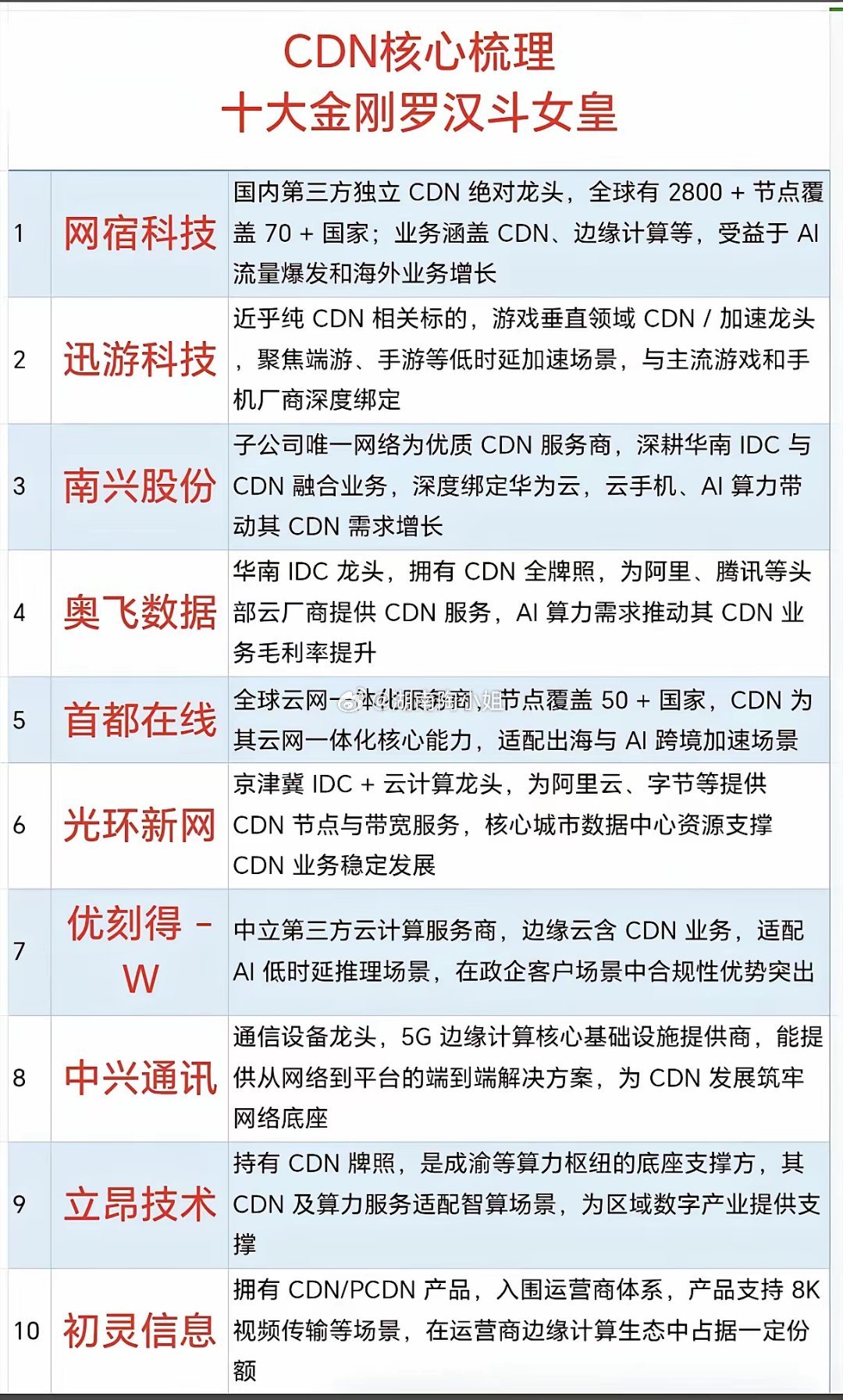 CDN赛道:AI与出海双引擎点燃,谁能成为下一个十倍股?当AI大模型的算力洪流与跨境数字内容的爆发式增长相遇,CDN(内容分发网络)不再是幕后的“隐形基建”,而是站在了科技浪潮的最前台。这张承载着全球数据流动的“数字高速公路”,正迎来属于它的黄金时代。从国内格局看,网宿科技作为第三方独立CDN绝对龙头,凭借2800+全球节点覆盖70+国家,在AI流量爆发与海外业务增长的双重驱动下,其边缘计算与全球化布局已构筑起难以撼动的壁垒;而迅游科技则在游戏垂直赛道深耕,为端游、手游提供低时延加速,与主流厂商的深度绑定让它在AI交互游戏的新场景中占得先机。南兴股份、奥飞数据等区域龙头,则依托IDC与CDN的融合业务,深度绑定华为云、阿里云等算力巨头,在AI算力需求的推动下,业务毛利率持续提升。放眼全球,首都在线的云网一体化服务覆盖50+国家,完美适配AI跨境加速场景;中兴通讯作为通信设备龙头,以5G边缘计算为CDN筑牢网络底座,为行业发展提供端到端的基础设施支撑。这些企业共同构成了中国CDN产业的“十大金刚”,在AI推理、8K视频、云手机等新场景中不断拓展边界。但机遇之下,风险亦不容忽视。部分标的因赛道热度提前透支涨幅,需警惕短期波动风险。不过,从长期逻辑看,AI对低时延、高带宽的刚性需求,叠加中国数字内容出海的浪潮,CDN行业的增长天花板已被彻底打开。它不再是简单的“流量搬运工”,而是成为算力网络的核心枢纽,连接着全球数字经济的每一个角落。当每一次AI交互、每一场跨境直播、每一部8K视频都依赖CDN的高效分发时,这个行业的价值终将被市场重新定义。站在新科技周期的起点,CDN赛道的每一次技术迭代与业务突破,都在书写着数字时代的增长神话。